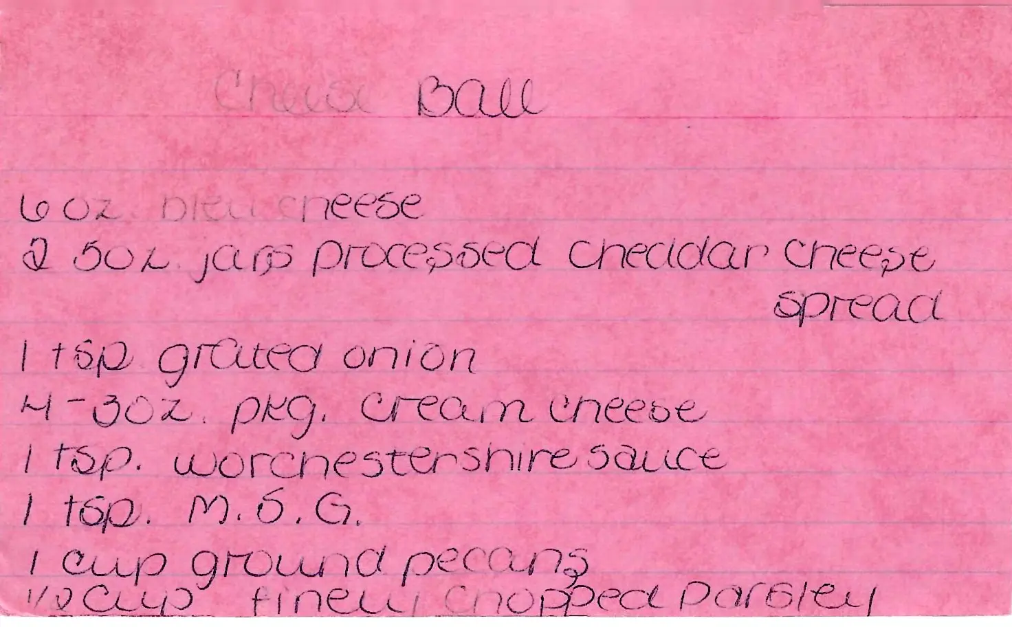 A rich and savory cheese ball made from a blend of diced cheddar, cream cheese, and cheese spread. Seasoned with onion and Worcestershire, with pecans both inside and out for a delightful crunch.