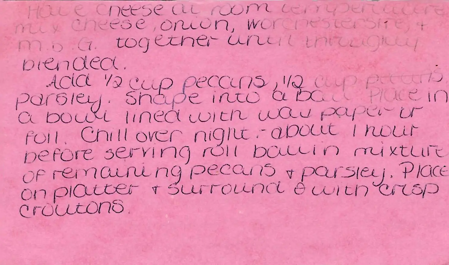 1. Ensure all cheeses are at room temperature for easier mixing. 2. In a large bowl, combine the softened cream cheese, processed cheddar spread, diced cheddar, grated onion, Worcestershire sauce, and optional MSG. 3. Mix with an electric mixer or by hand until thoroughly blended and smooth. 4. Stir in 1/2 cup of the ground pecans. 5. Shape the mixture into a large ball and place it in a bowl lined with wax paper or foil. 6. Cover and chill overnight, or for at least 8 hours, until very firm. 7. About an hour before serving, combine the remaining 1/2 cup of pecans and the finely chopped parsley on a plate or a sheet of wax paper. 8. Unwrap the chilled cheese ball and roll it in the pecan-parsley mixture until evenly coated. 9. Place on a platter and serve with crisp crackers or croutons.