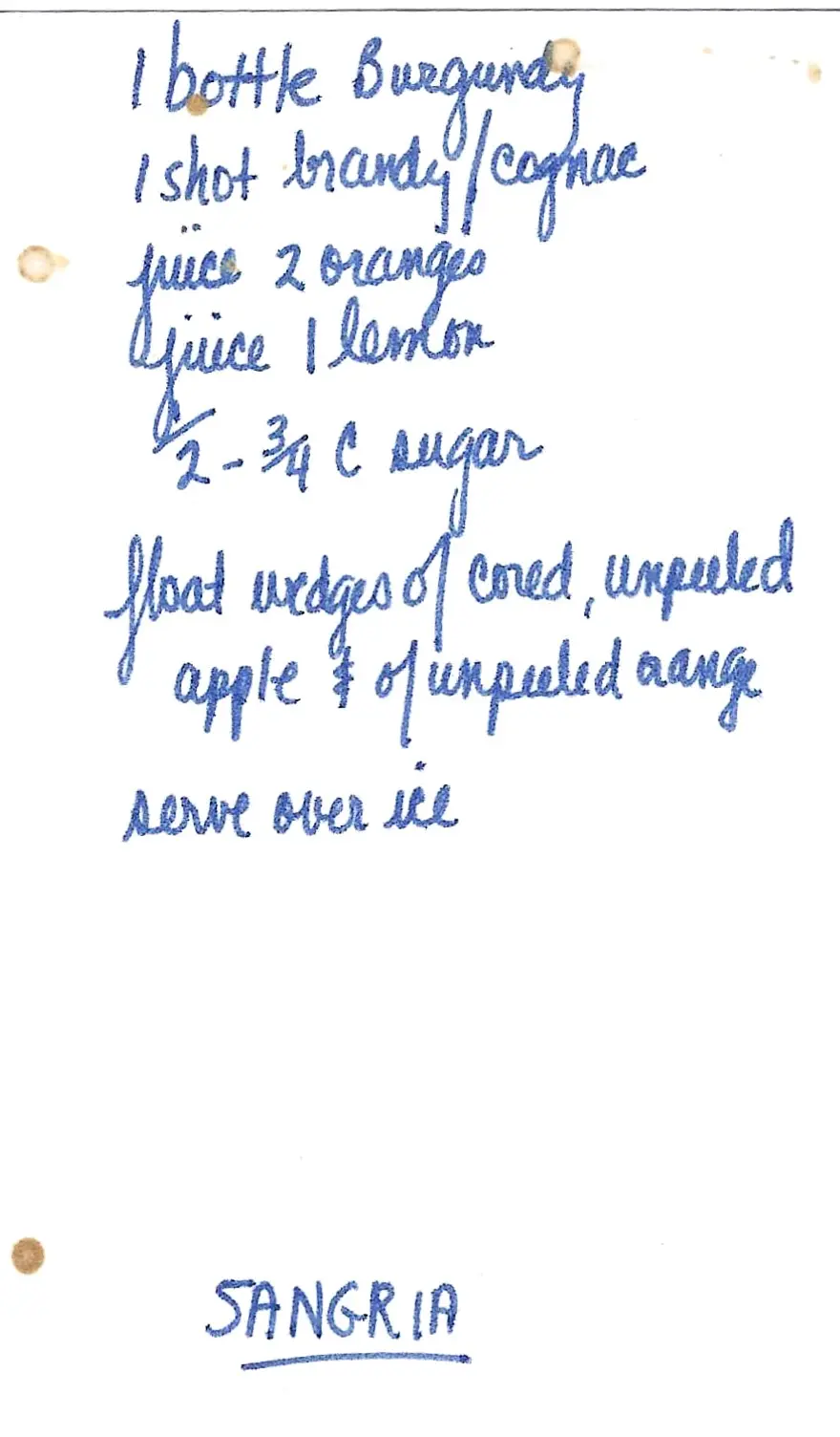 A robust and fruity red wine sangria, fortified with a shot of brandy and flavored with fresh-squeezed orange and lemon juice. Garnished with fresh apple and orange slices.