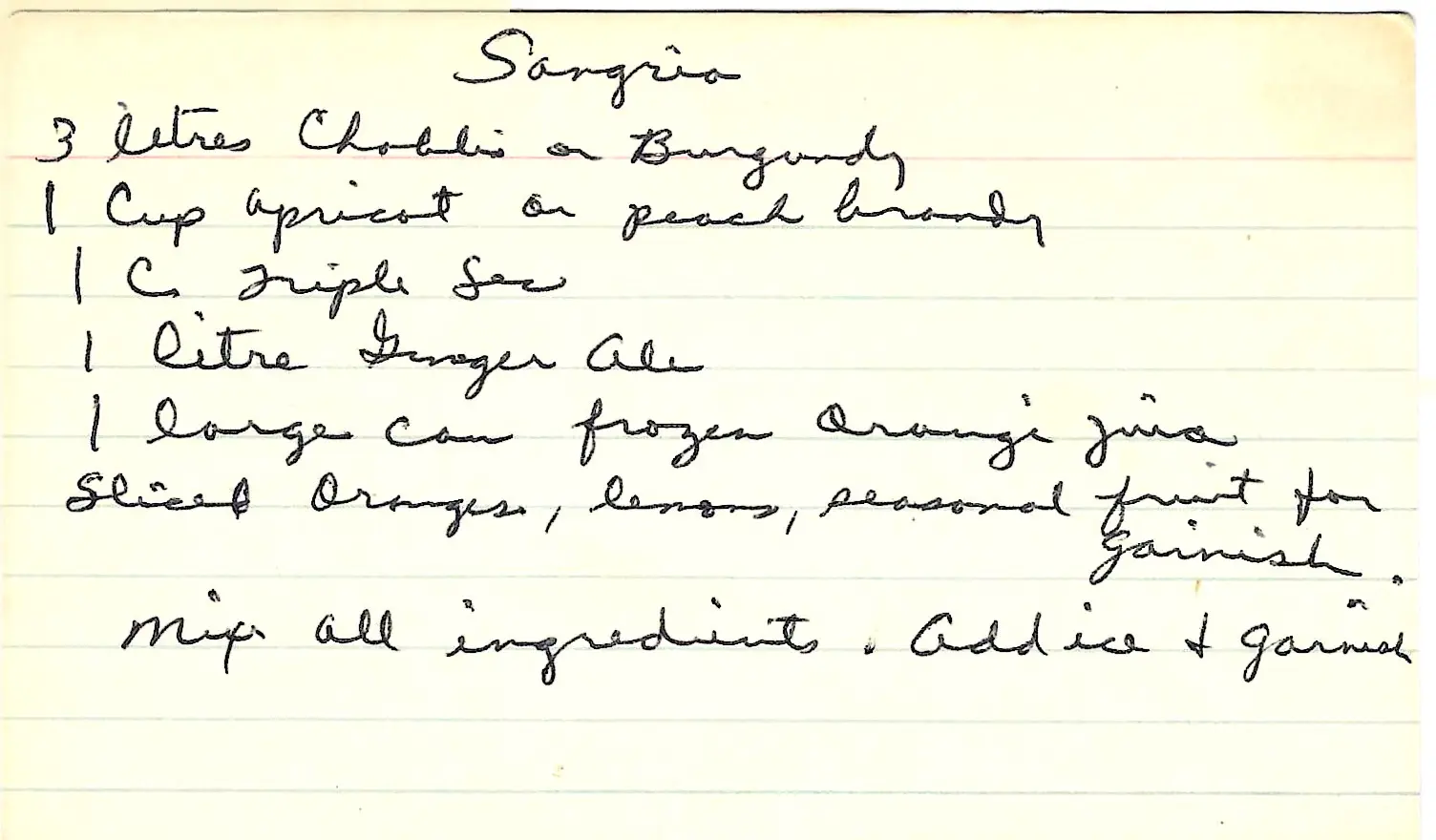 A simple and potent sangria recipe perfect for a crowd, made with a base of Chablis or Burgundy wine, apricot or peach brandy, and triple sec. Topped with ginger ale for a fizzy finish.