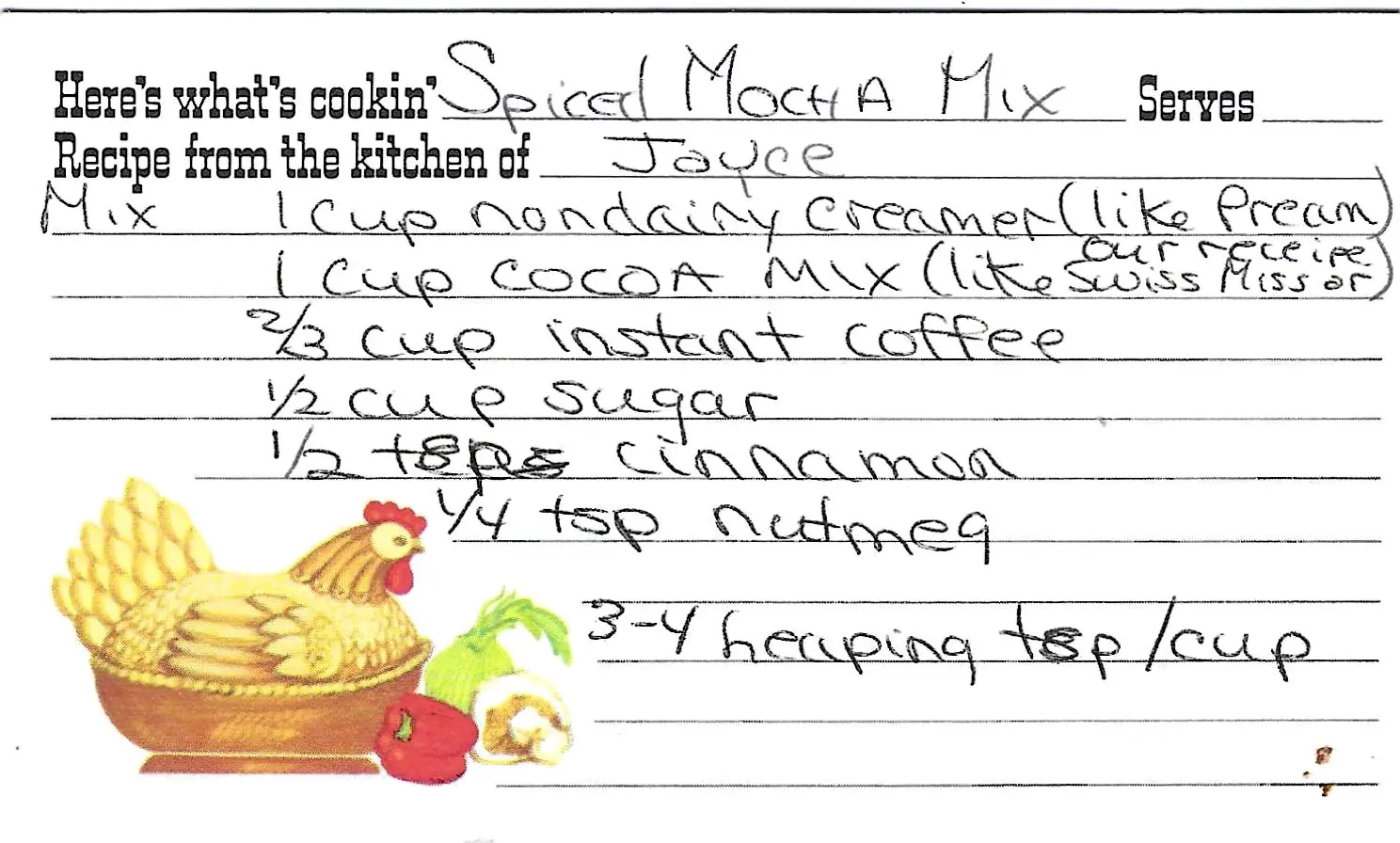 - In a large bowl, mix together the nondairy creamer, cocoa mix, instant coffee, sugar, cinnamon, and nutmeg.