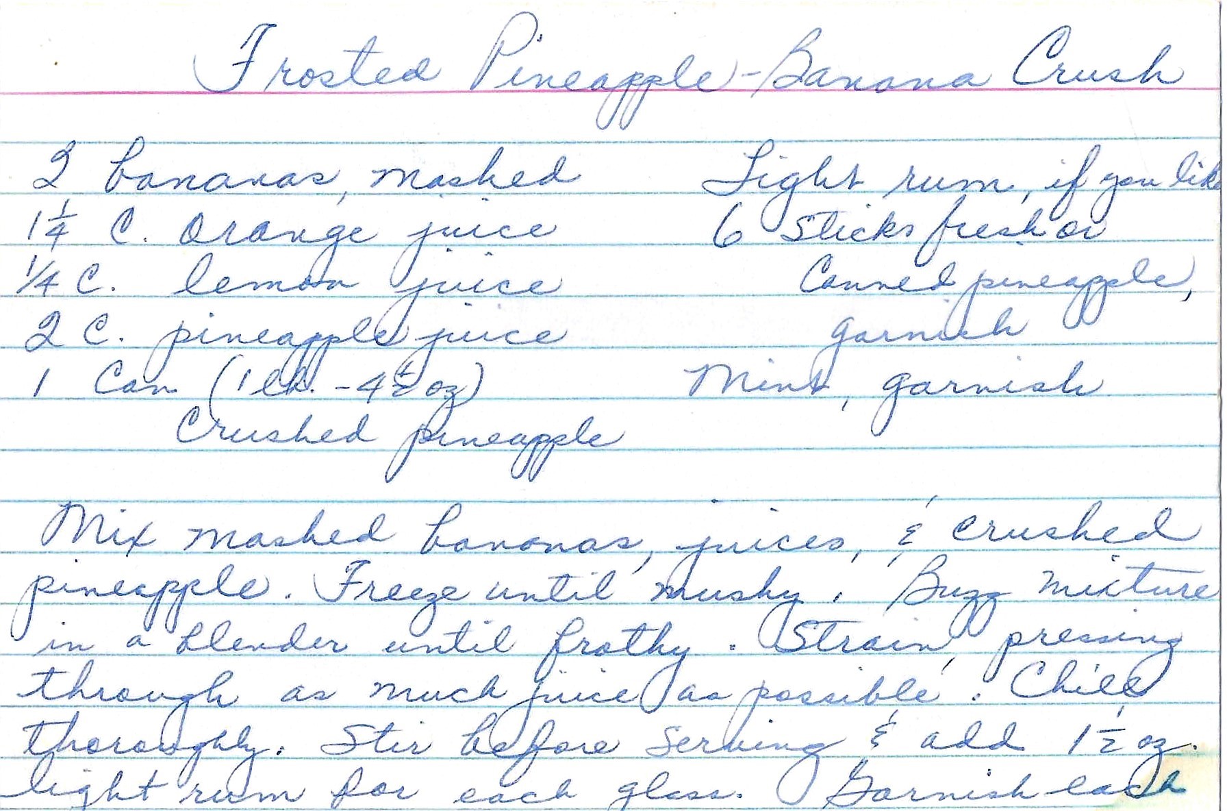 - In a large bowl, mix the mashed bananas, orange juice, lemon juice, pineapple juice, and crushed pineapple.