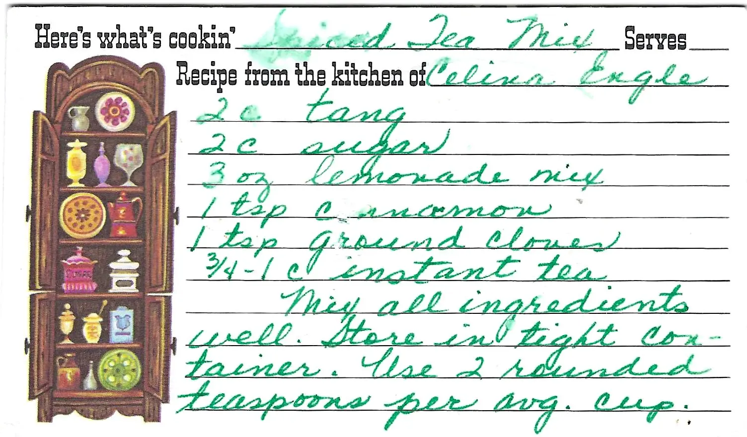 A classic instant spiced tea mix from Celina Engle. This recipe combines the zesty citrus flavors of Tang and lemonade with instant tea and warm spices for a quick and comforting hot beverage.