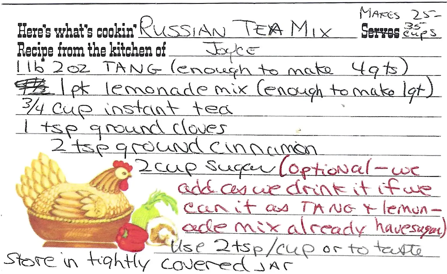 A classic, comforting instant ‘Russian Tea’ mix recipe from Joyce. This tangy and spiced drink mix combines Tang, lemonade, instant tea, and warm spices for a quick and easy treat.