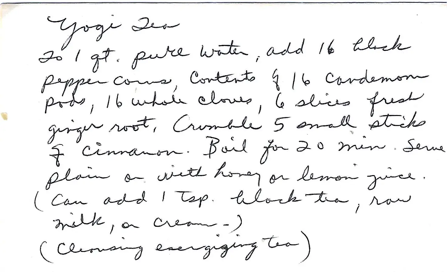 A traditional, warming Yogi Tea recipe. This naturally caffeine-free beverage is made by boiling whole spices like peppercorns, cardamom, cloves, cinnamon, and fresh ginger in water.
