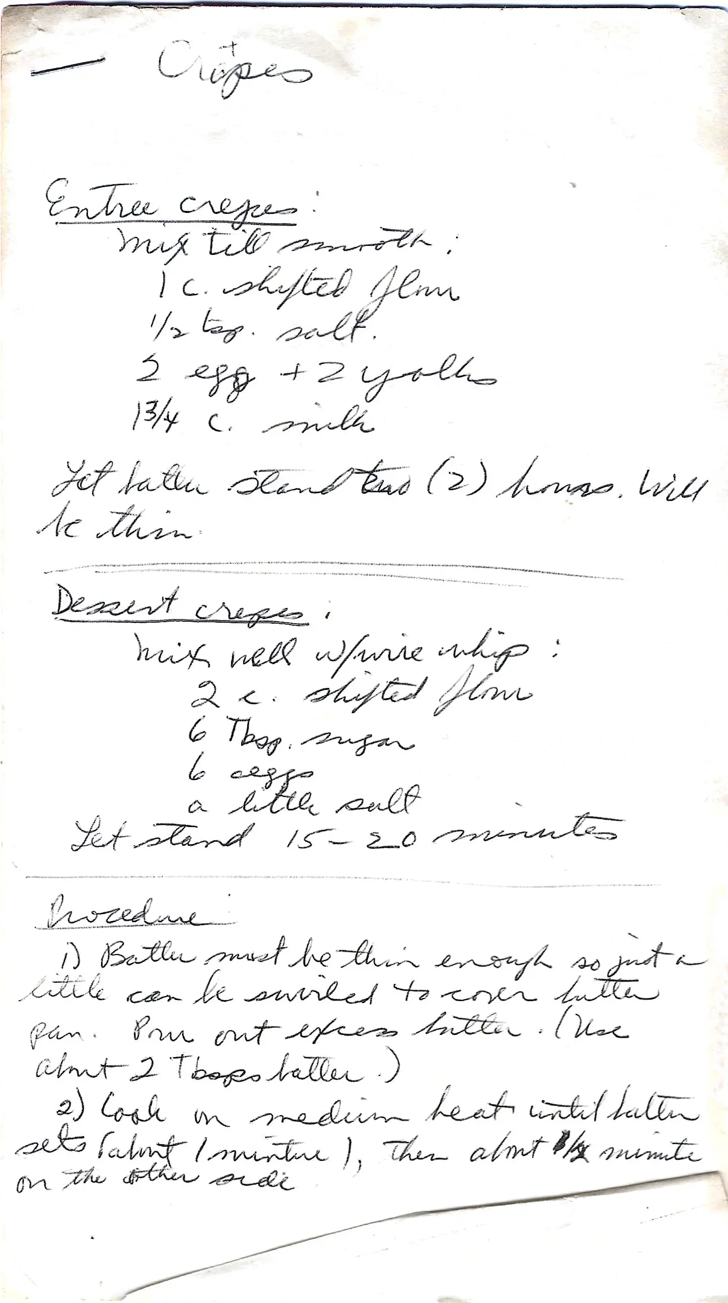 The original recipe card did not list a liquid, which is essential for crepe batter. Three cups of milk have been added to create a standard, workable batter based on the amount of flour and eggs. You can also use a mix of milk and water.