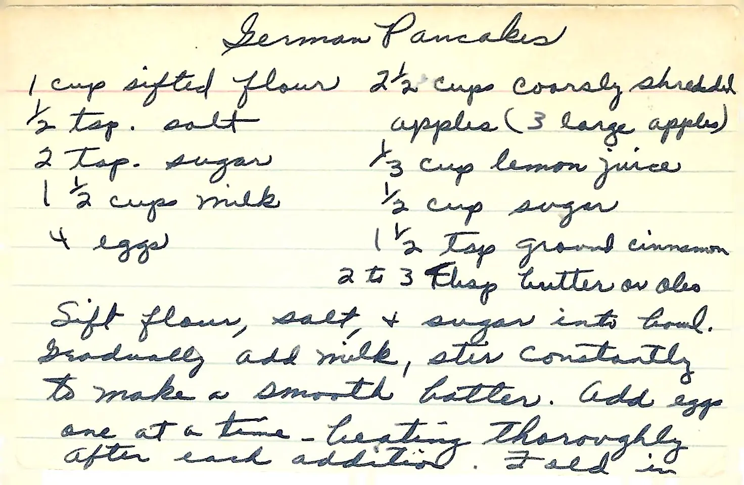 A recipe for classic German apple pancakes. These hearty, crepe-like pancakes are filled with shredded apples and served with a sweet cinnamon-sugar topping.