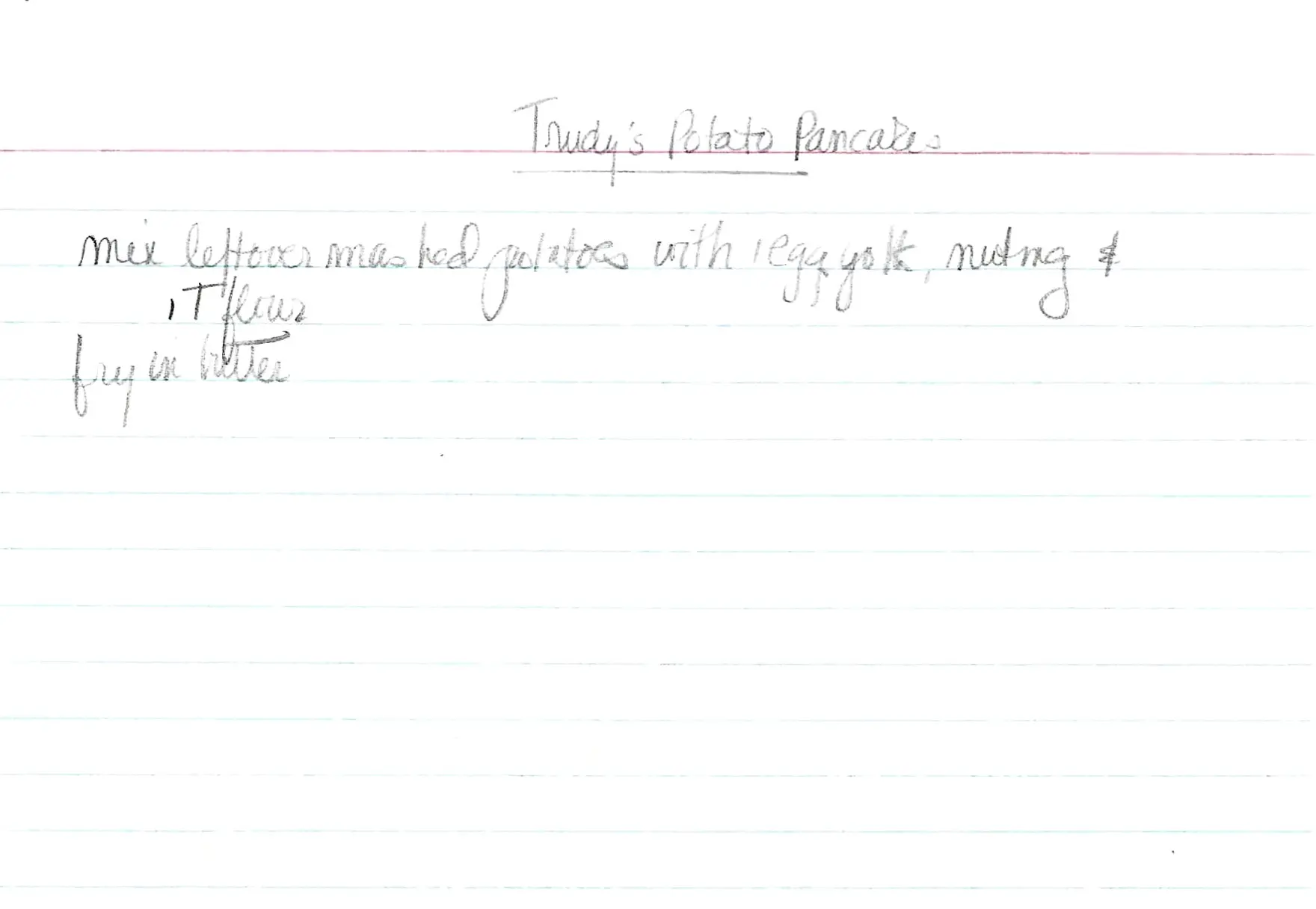A clever and delicious recipe from Trudy for turning leftover mashed potatoes into savory pancakes. Enriched with an egg yolk and a hint of nutmeg, they’re fried in butter until golden.