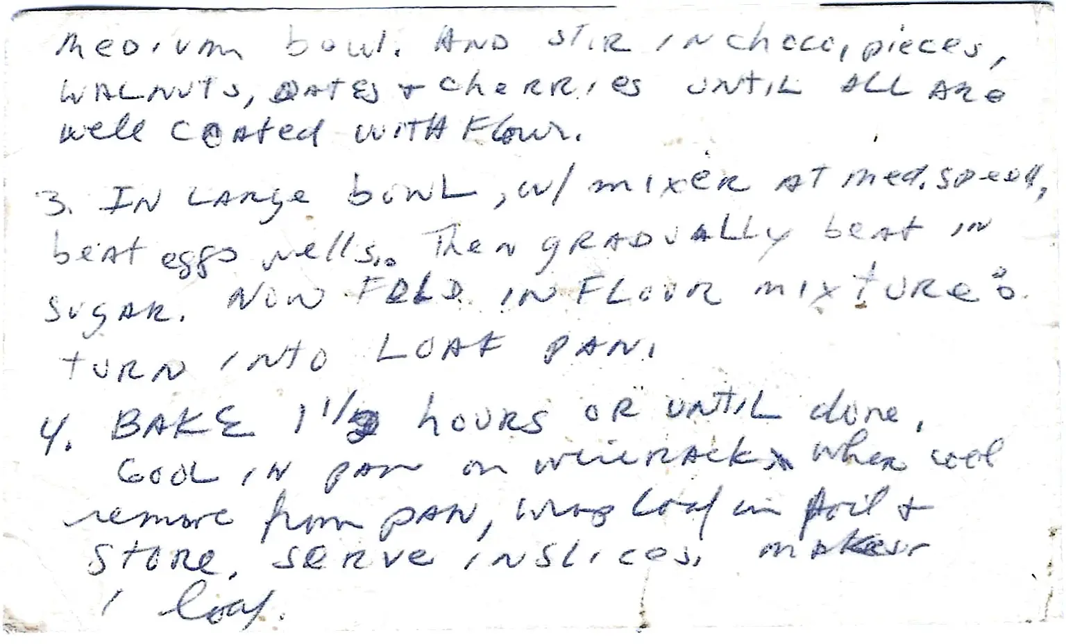 - Fold the flour, fruit, and nut mixture into the egg and sugar mixture until just combined.