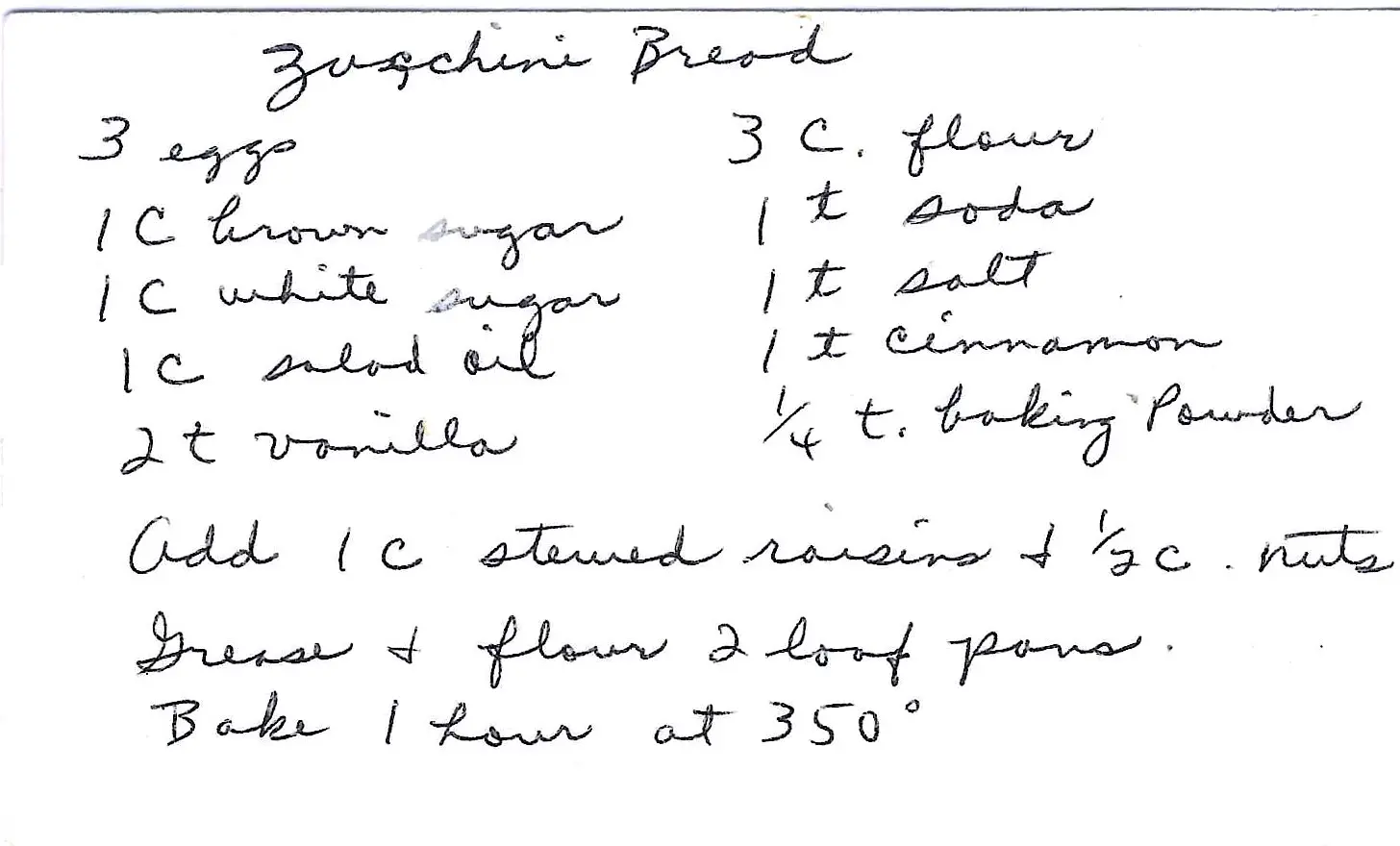 The original recipe card is titled “Zucchini Bread” but does not actually list zucchini as an ingredient. This recipe creates a delicious spiced raisin-nut bread.