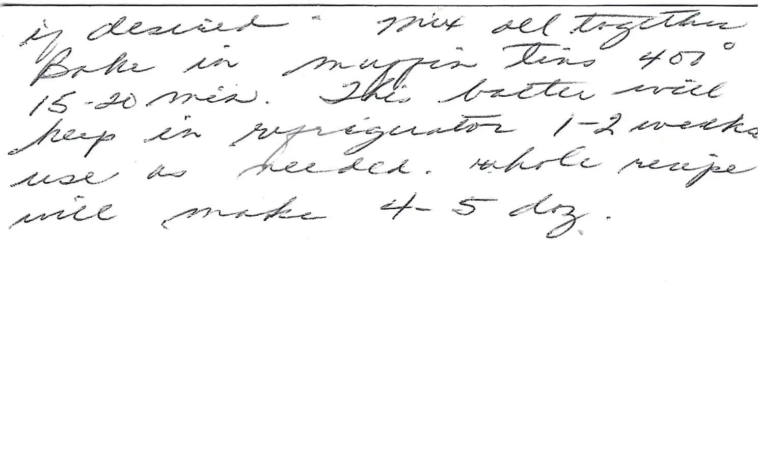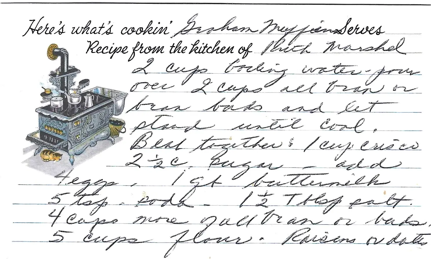 A fantastic, large-batch refrigerator bran muffin recipe from Ruth Marshel. Although the card is titled “Graham Muffins,” the ingredients are for a classic bran muffin. The batter keeps for weeks, so you can have fresh muffins anytime.