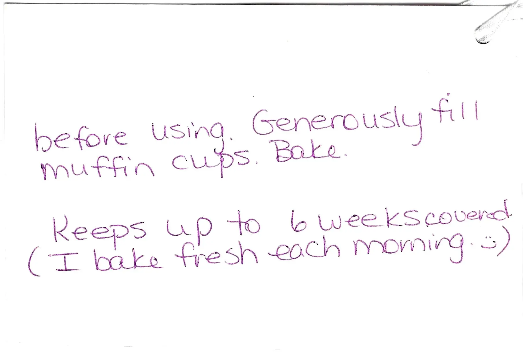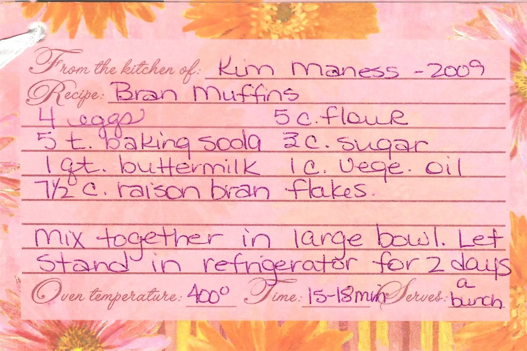 A fantastic large-batch bran muffin recipe from Kim Maness (2009). The batter is designed to be stored in the refrigerator for up to 6 weeks, so you can bake fresh muffins whenever you like.