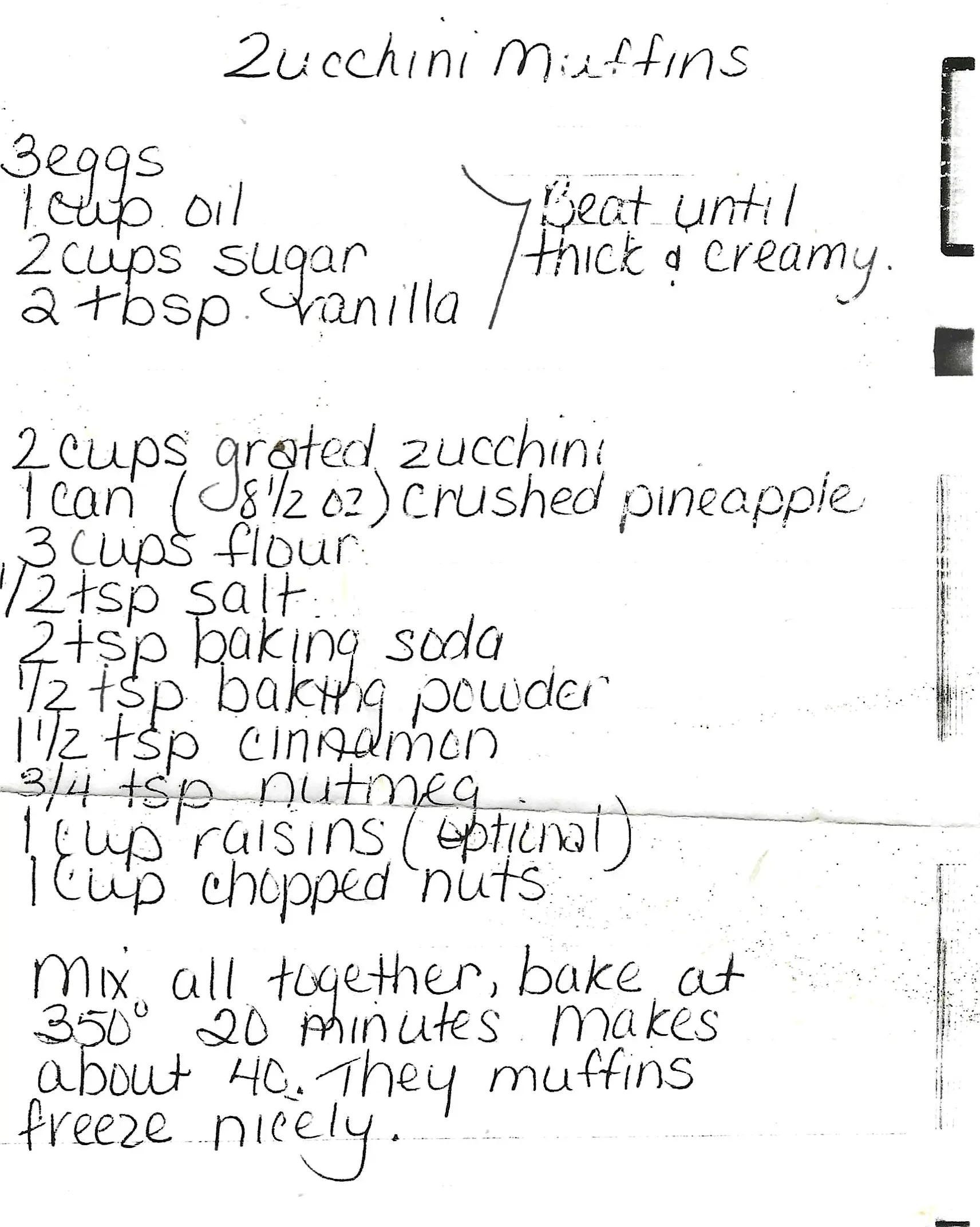 This recipe makes about 40 muffins. Allow muffins to cool in the tins for a few minutes before transferring them to a wire rack to cool completely. The card notes that “These muffins freeze nicely.”
