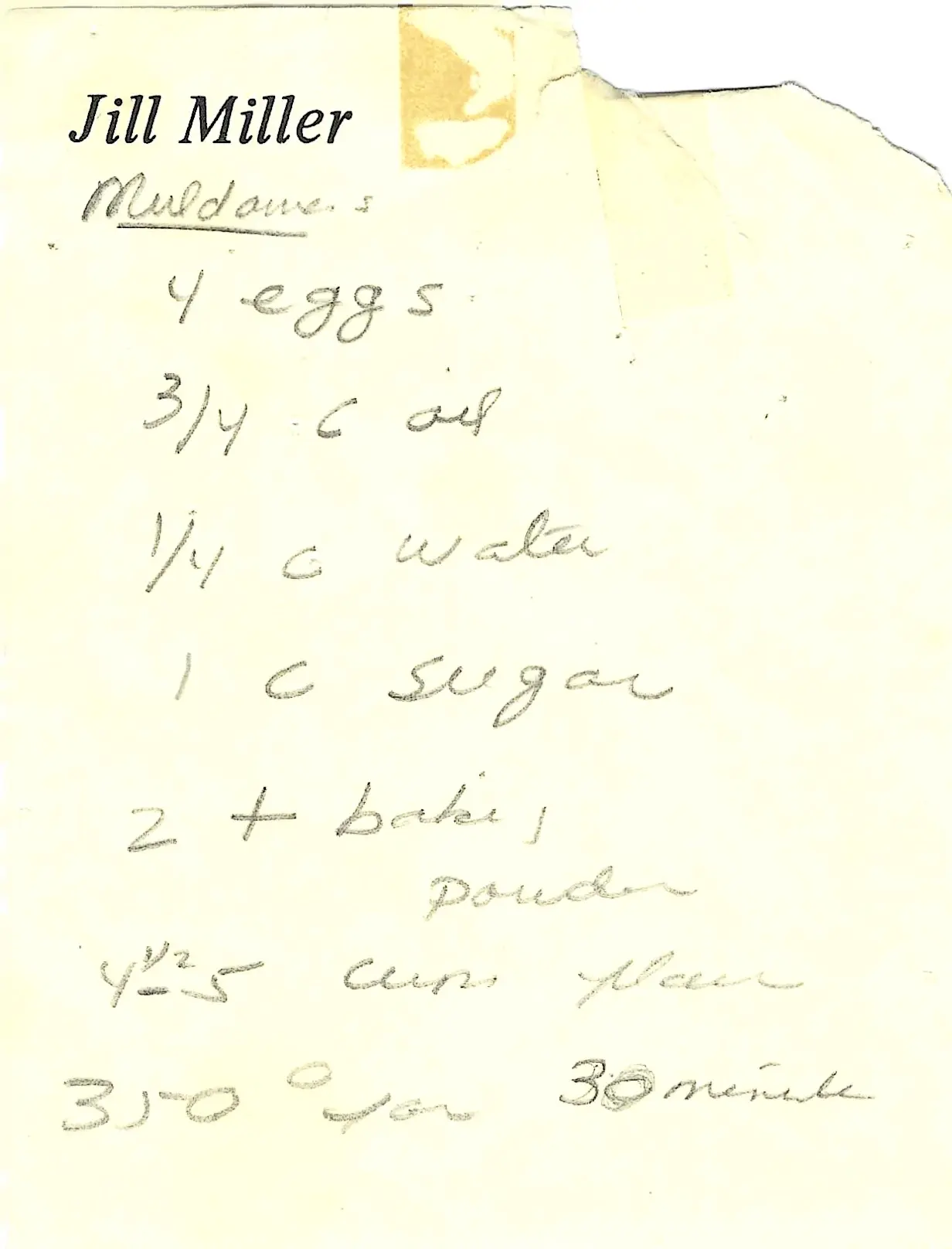 A simple cake or quick bread recipe from Jill Miller. The exact nature of “Muldoves” is unknown, but the batter is a straightforward mix of flour, sugar, eggs, and oil.
