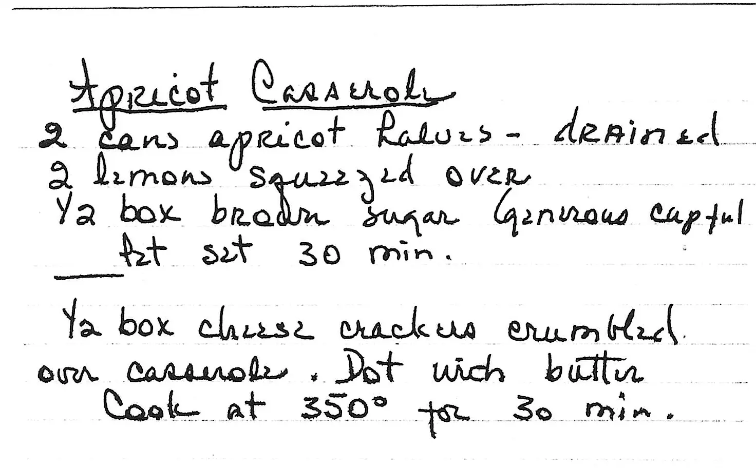A unique and delicious side dish or simple dessert, this apricot casserole features sweet apricot halves macerated in lemon juice and brown sugar, topped with a crunchy, savory cheese cracker crumble.