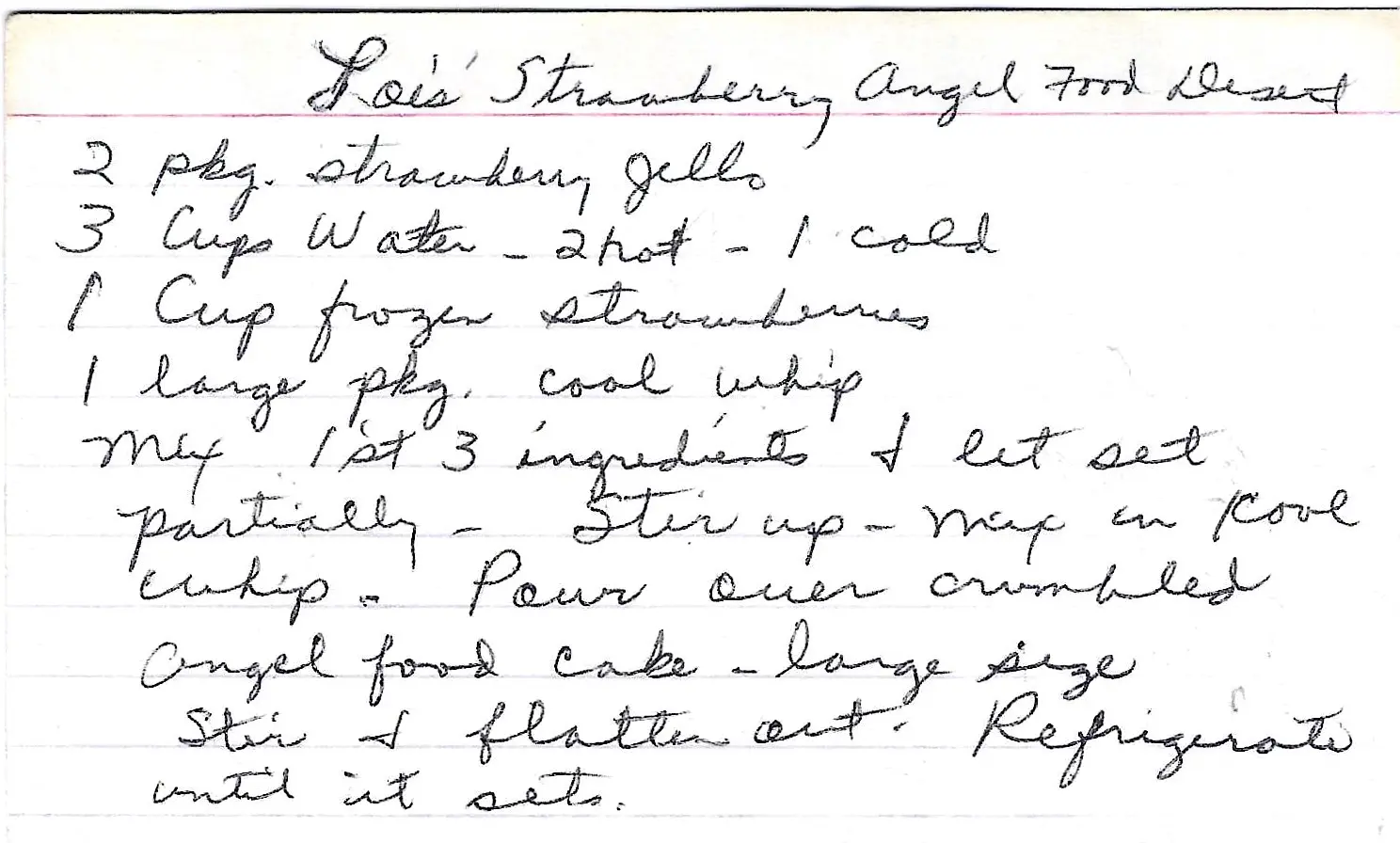 A light and fluffy no-bake dessert from Lois. This simple recipe layers crumbled angel food cake with a creamy mixture of strawberry Jello, Cool Whip, and frozen strawberries.