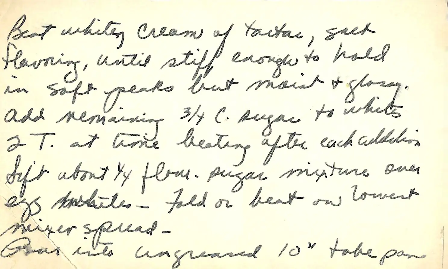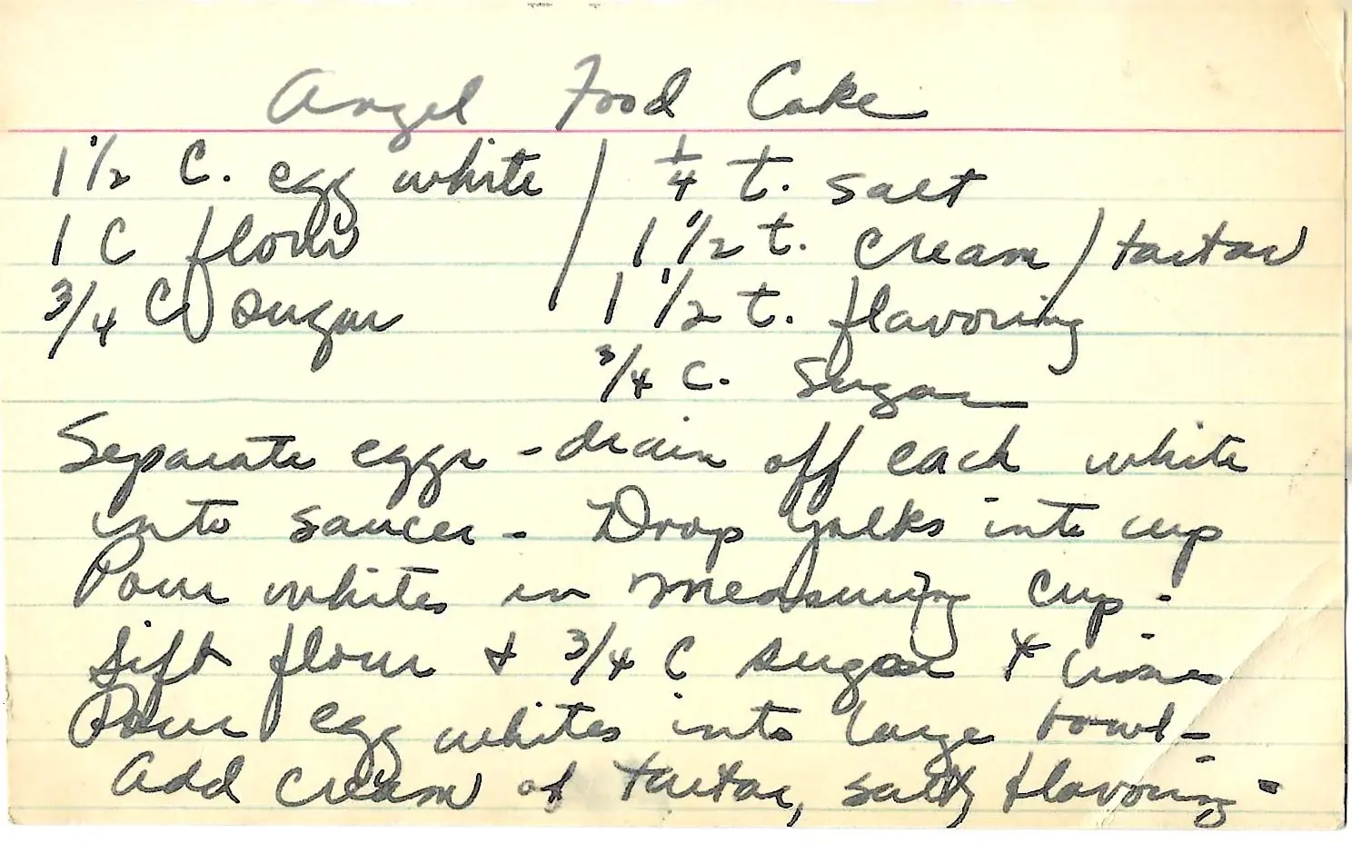 The recipe card’s instructions for separating eggs (draining each white into a saucer first) is a classic technique to ensure no yolk contaminates the batch, as any fat will prevent the egg whites from whipping properly.