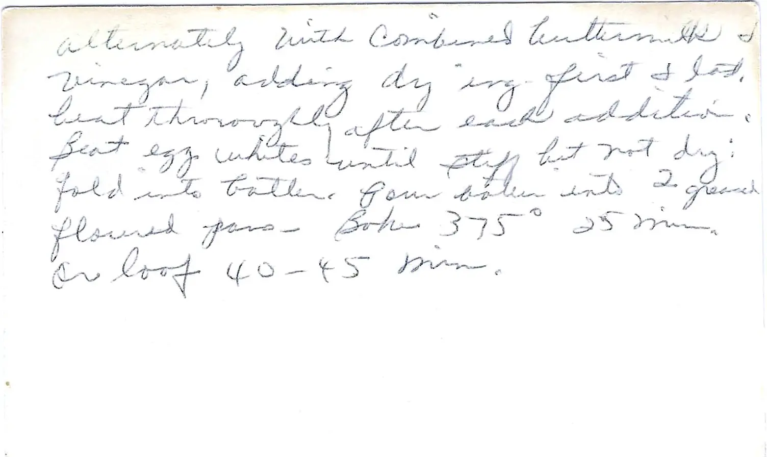 - Add the dry ingredients to the creamed mixture in three parts, alternating with the buttermilk-vinegar mixture in two parts. Begin and end with the dry ingredients. Beat thoroughly after each addition.