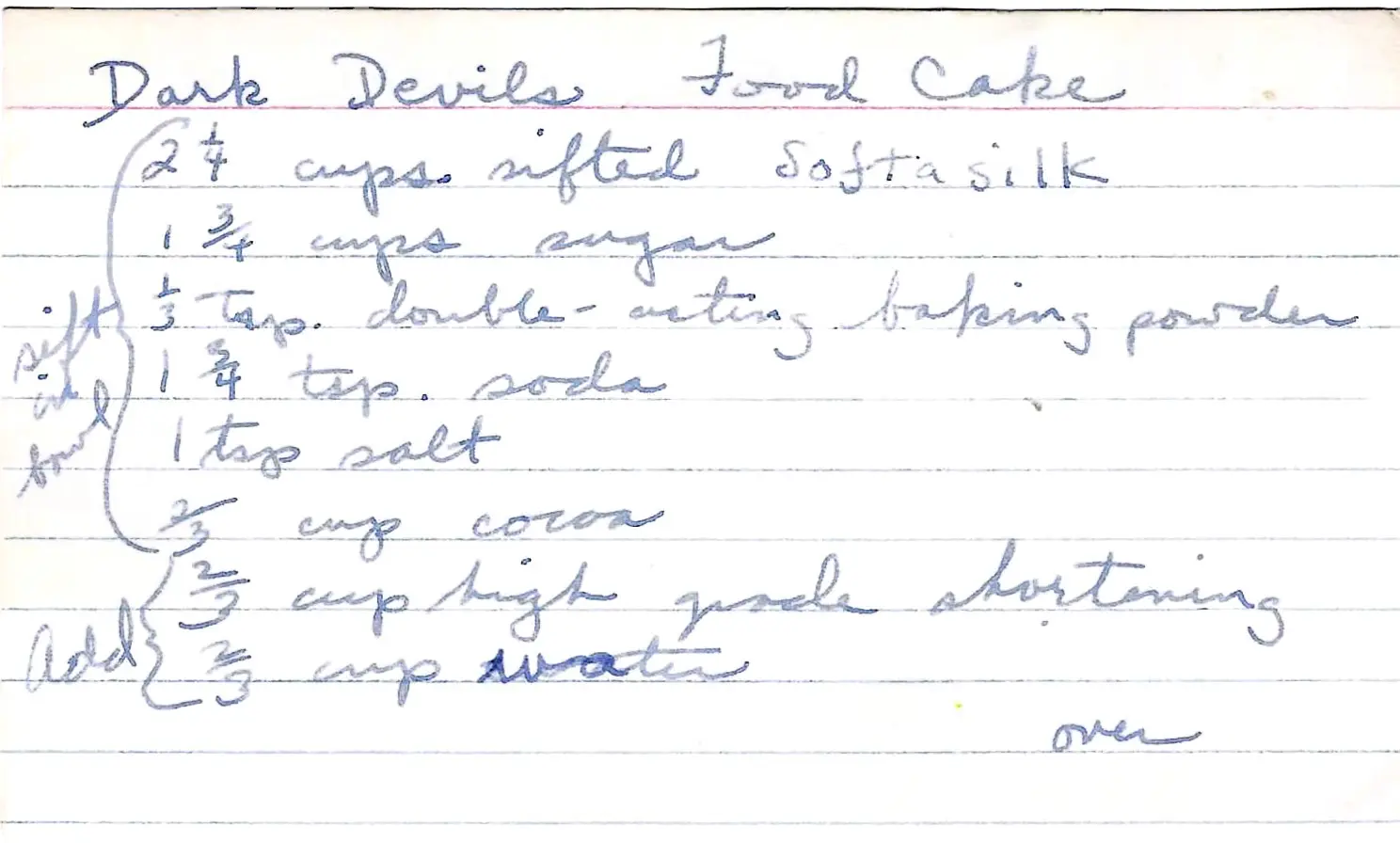 The recipe card title “Coquilles” is French for “shells” and is an unusual name for this type of cake. The ingredients and method are for a classic Devil’s Food Cake.