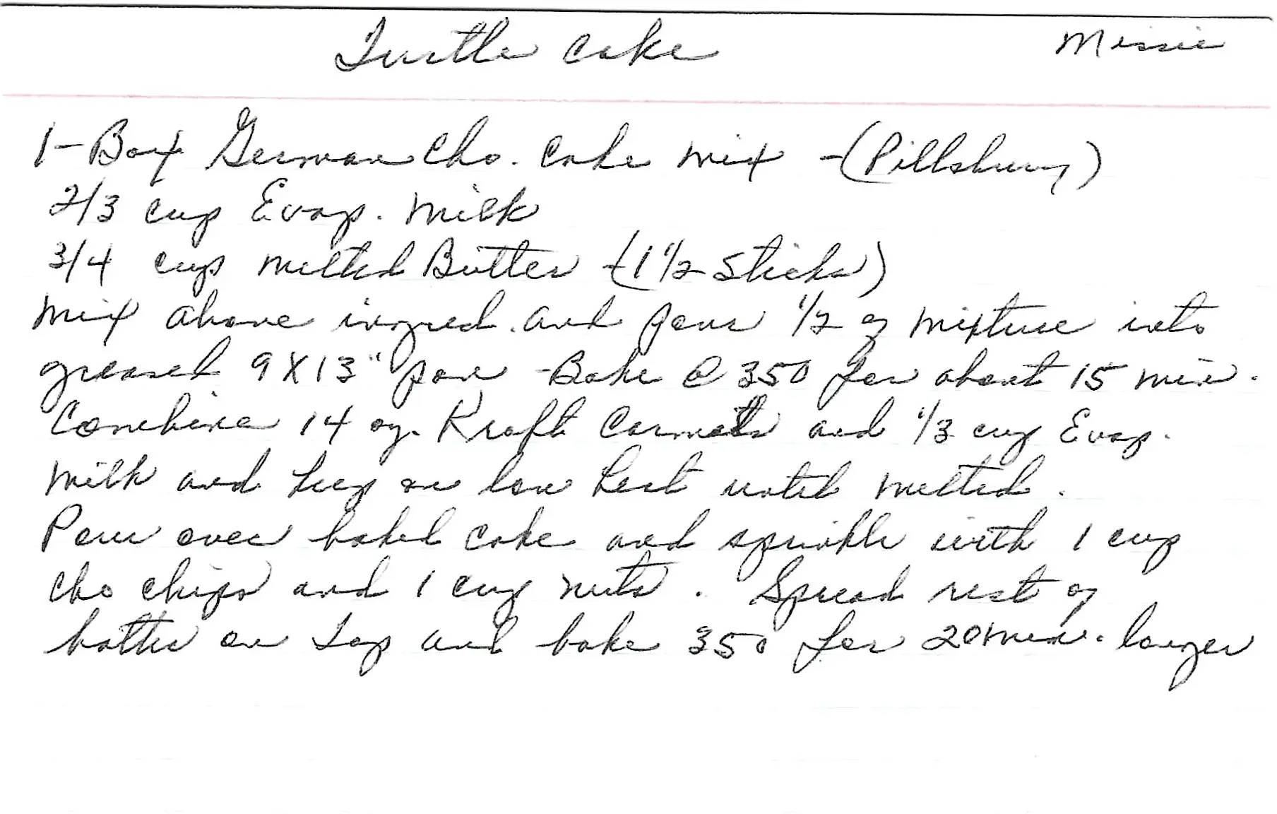 A decadent, layered dessert from Mamie with all the flavors of a classic turtle candy. This recipe uses a simple German Chocolate cake mix batter as the crust and topping for a gooey center of melted caramels, chocolate chips, and nuts.