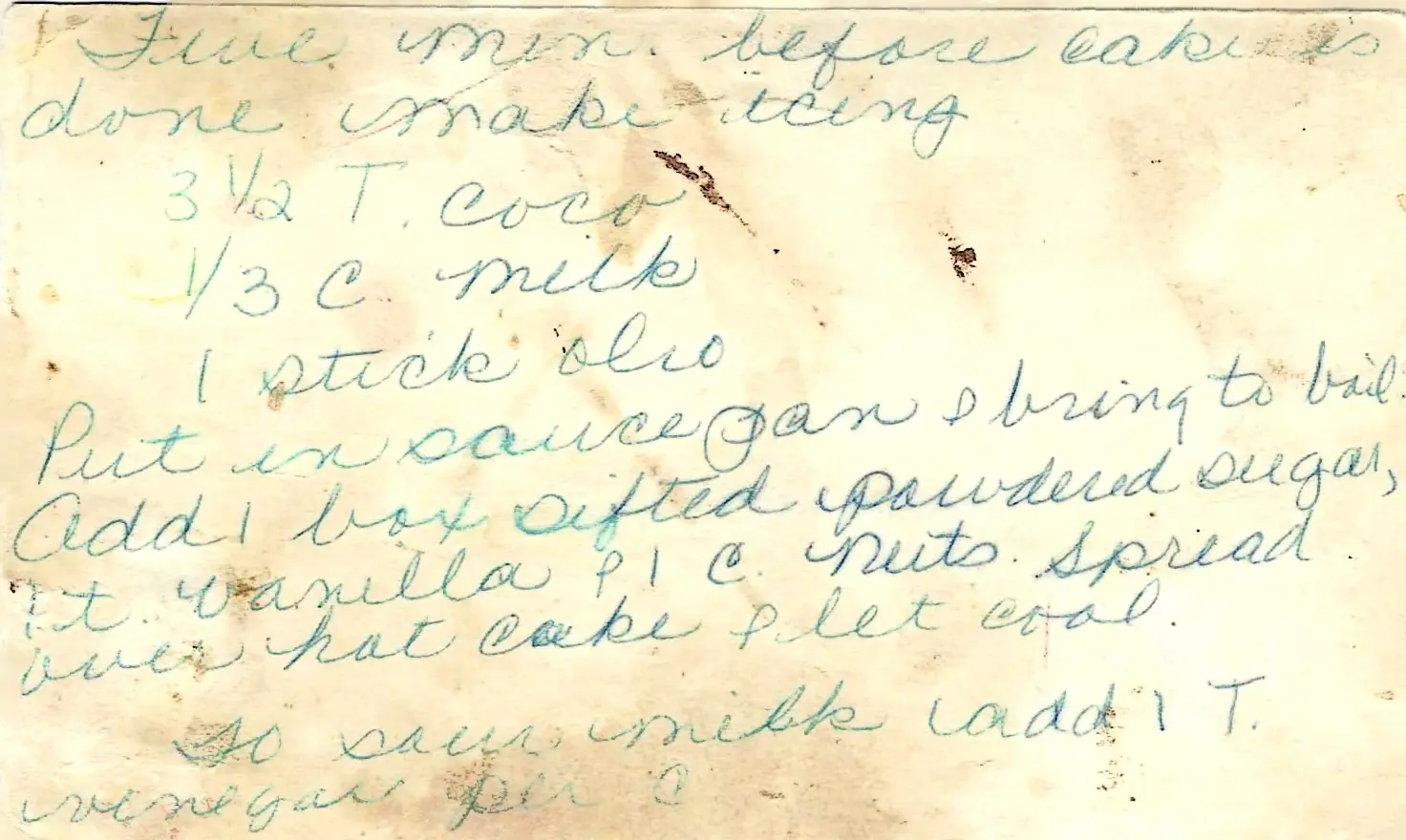 - Prepare the Icing: About 5 minutes before the cake is done, begin the icing. In a saucepan, bring the 3 ½ tablespoons cocoa, ⅓ cup milk, and 1 stick of oleo/butter to a boil.