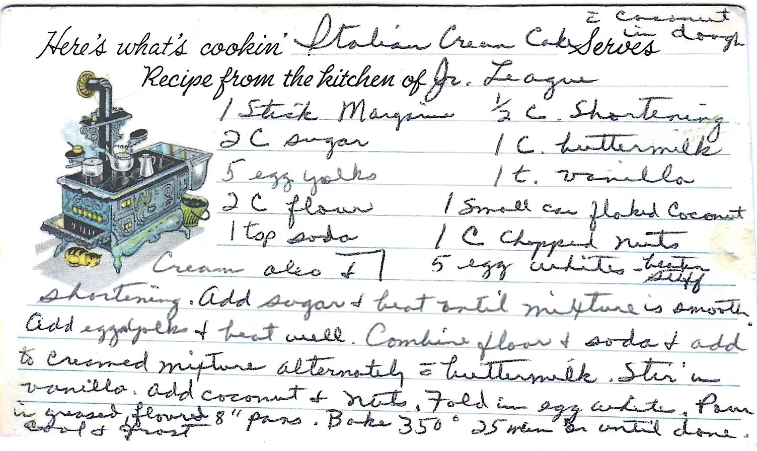 The original recipe card is missing the amount for baking soda. One teaspoon has been added, which is a standard amount for this recipe and works with the buttermilk to leaven the cake.