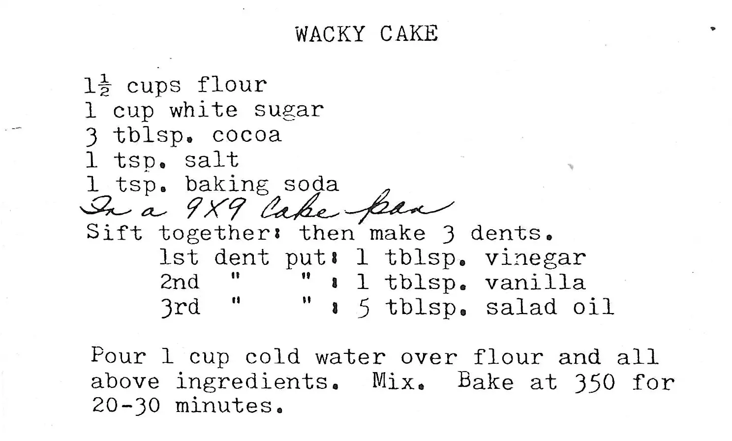 A classic ‘Wacky Cake’ or ‘Depression Cake’ that is magically moist and rich despite containing no eggs, butter, or milk. This simple chocolate cake is mixed directly in the baking pan.
