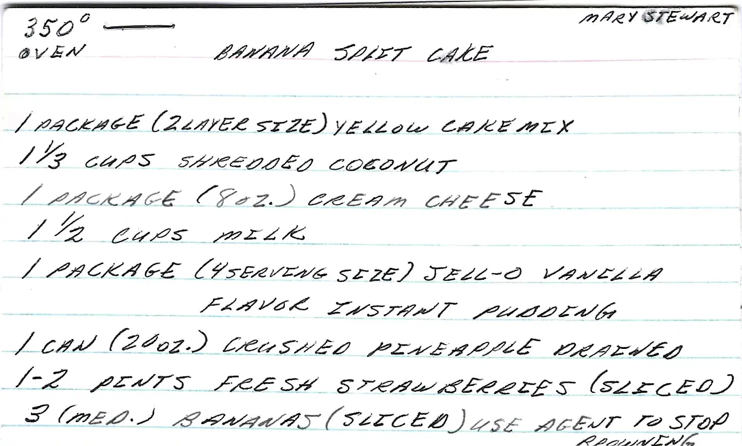 A spectacular layered dessert from Mary Stewart with all the flavors of a banana split. This version uses a baked yellow cake base, which is then topped with bananas, a creamy pudding filling, strawberries, pineapple, and whipped cream.