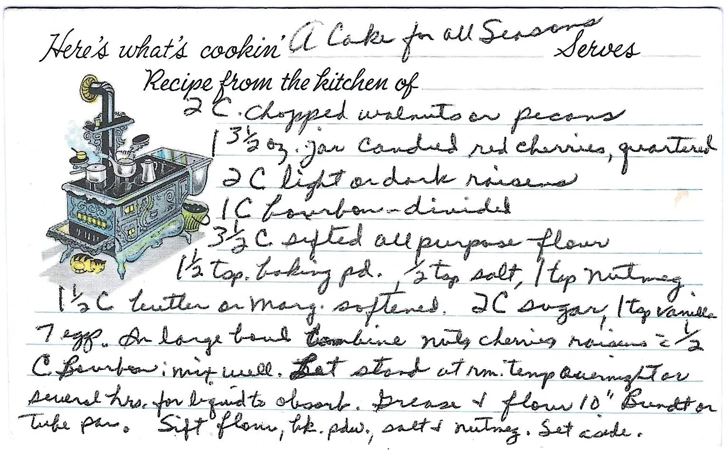 A rich, classic fruitcake designed to last for weeks. This recipe features walnuts, cherries, and raisins soaked in bourbon, baked into a dense, buttery cake that is then aged in a bourbon-soaked cheesecloth to develop its flavor.