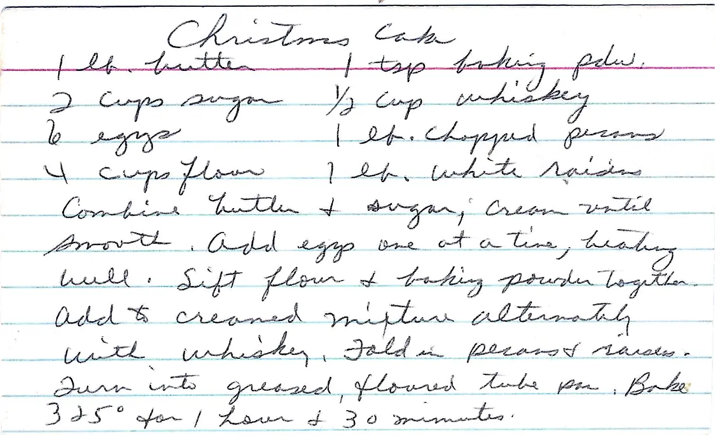 A rich, dense, and buttery holiday cake, packed with a pound of pecans and a pound of white raisins, and flavored with a generous amount of whiskey. A classic fruitcake-style dessert.