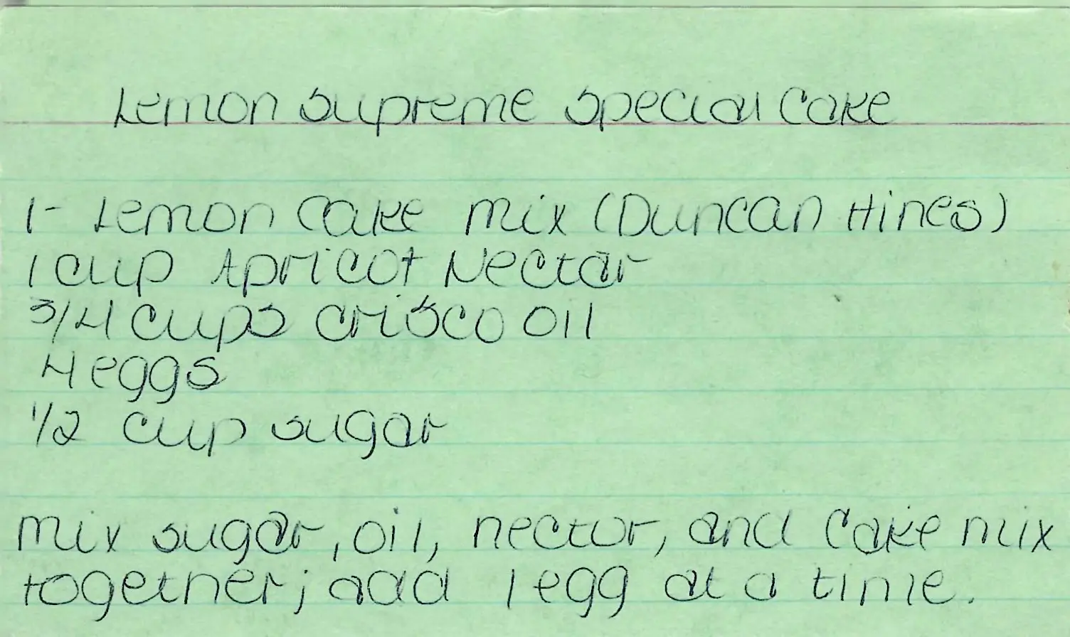 | 1 package | Lemon Cake Mix (Duncan Hines) |