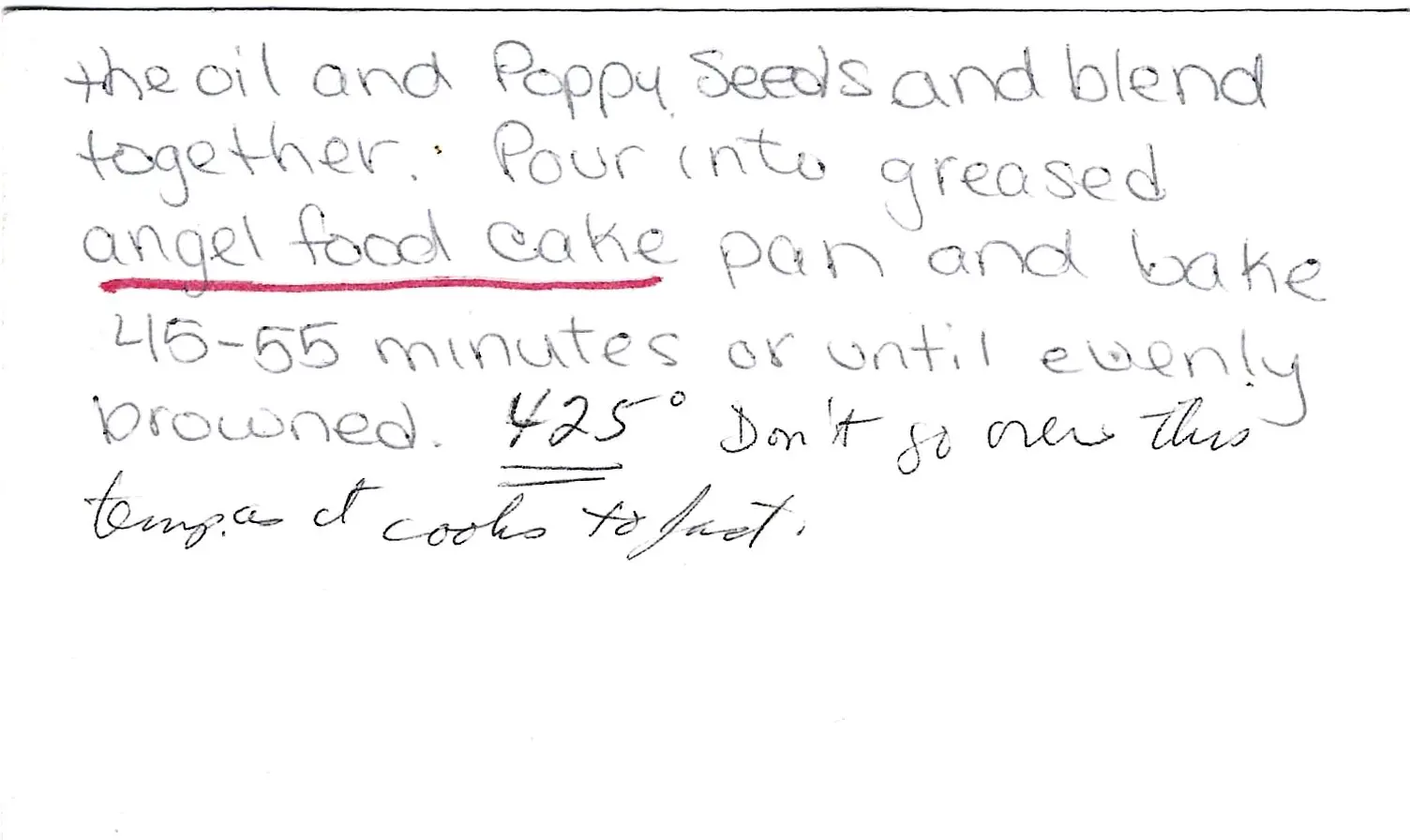 The original recipe card suggests a high baking temperature of 425°F but also warns that it cooks fast. A more standard and reliable temperature for this type of cake is 350°F, which is used in the instructions above. If you choose to bake at 425°F, watch the cake very carefully and start checking for doneness much earlier.