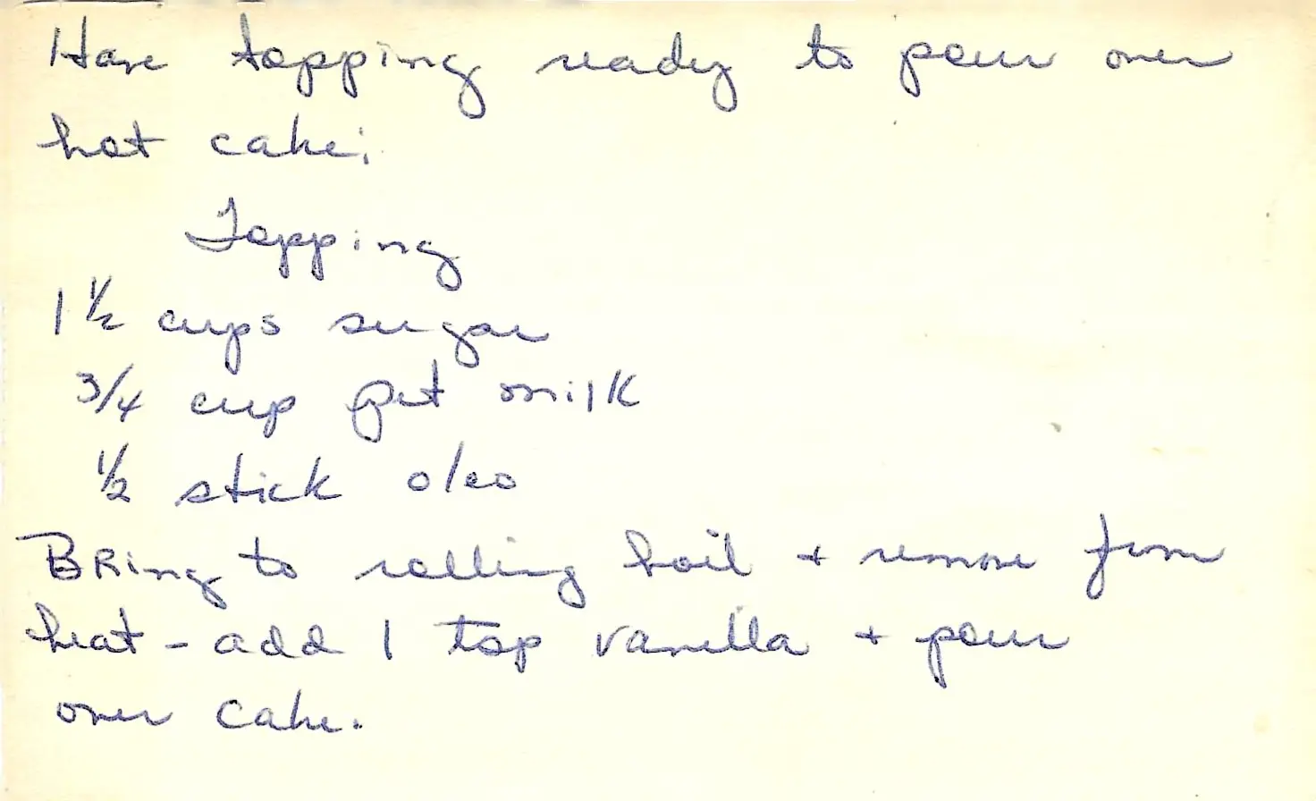 - Make Glaze: While the cake is baking, prepare the glaze. In a saucepan, combine the 1 ½ cups sugar, buttermilk, and oleo/butter. Bring to a rolling boil.