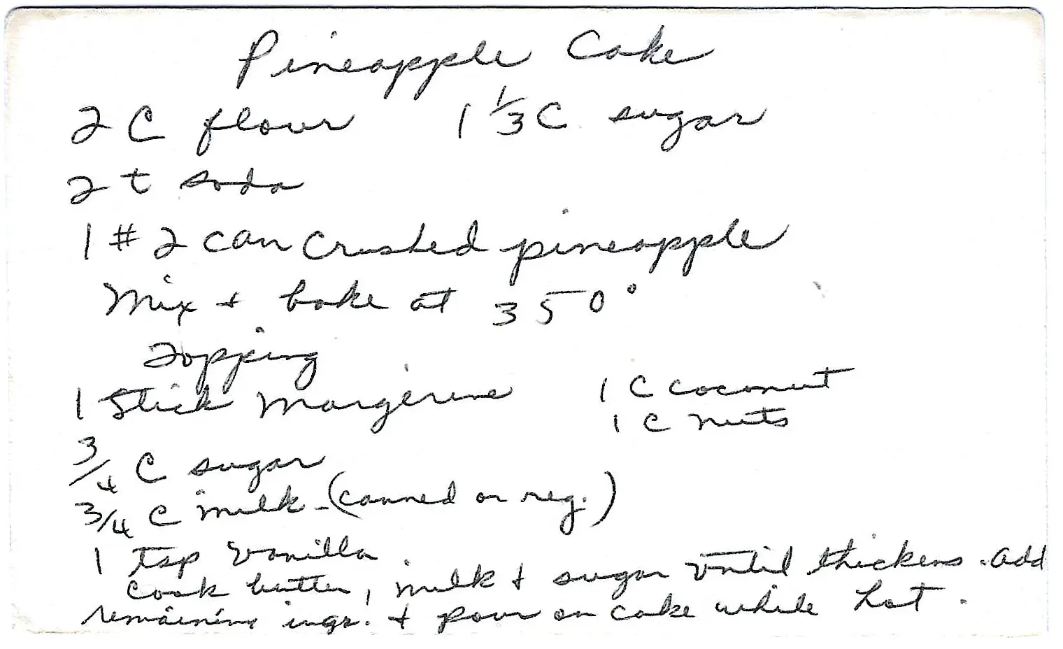 The original recipe card did not list eggs, which are essential for the cake’s structure. Two eggs have been added, which is a standard amount for a cake of this size.