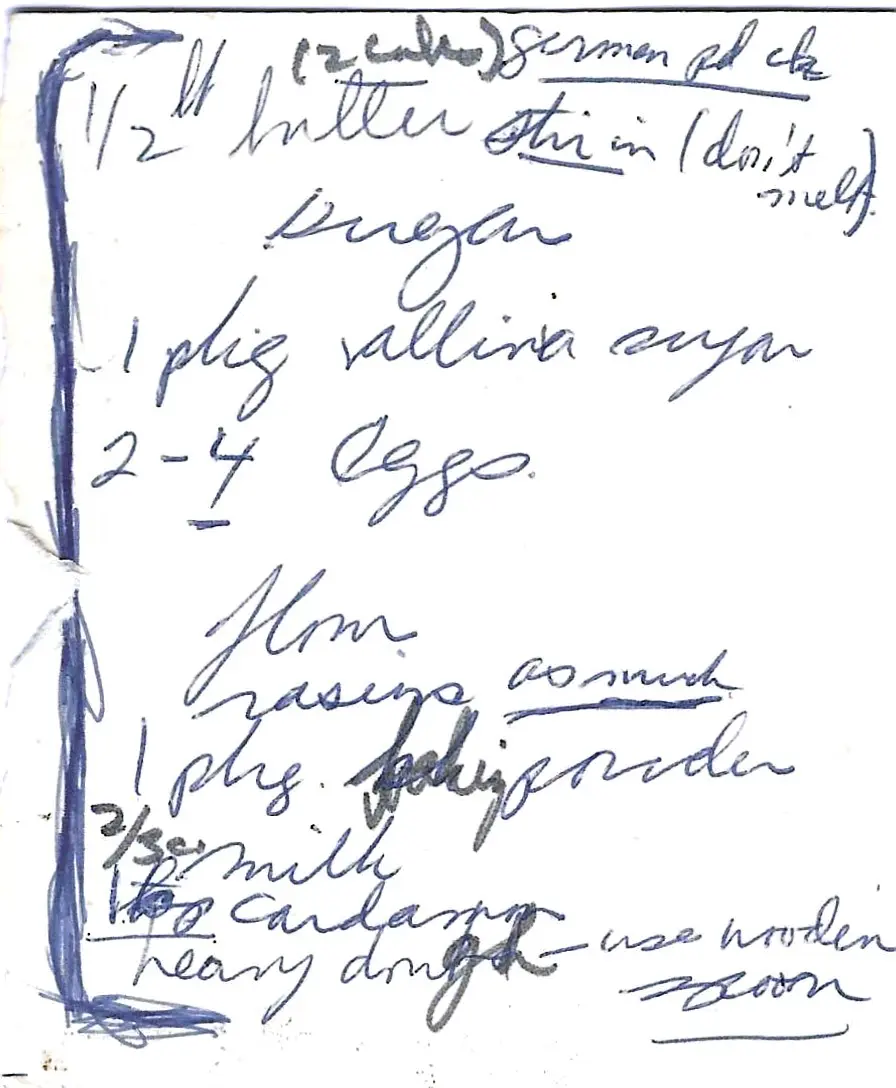 The original recipe card is a “baker’s recipe” and omits specific measurements for sugar and flour, and doesn’t mention the plum topping which is essential for a Pflaumenkuchen. Standard amounts have been added to create a complete, traditional recipe.