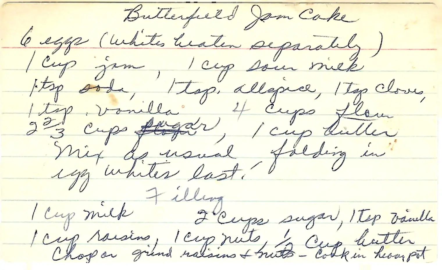 A classic, rich, and spicy Butterfield Jam Cake. This traditional layer cake has a dense, moist crumb from the jam and buttermilk in the batter, and it’s paired with a delicious cooked raisin and nut filling.