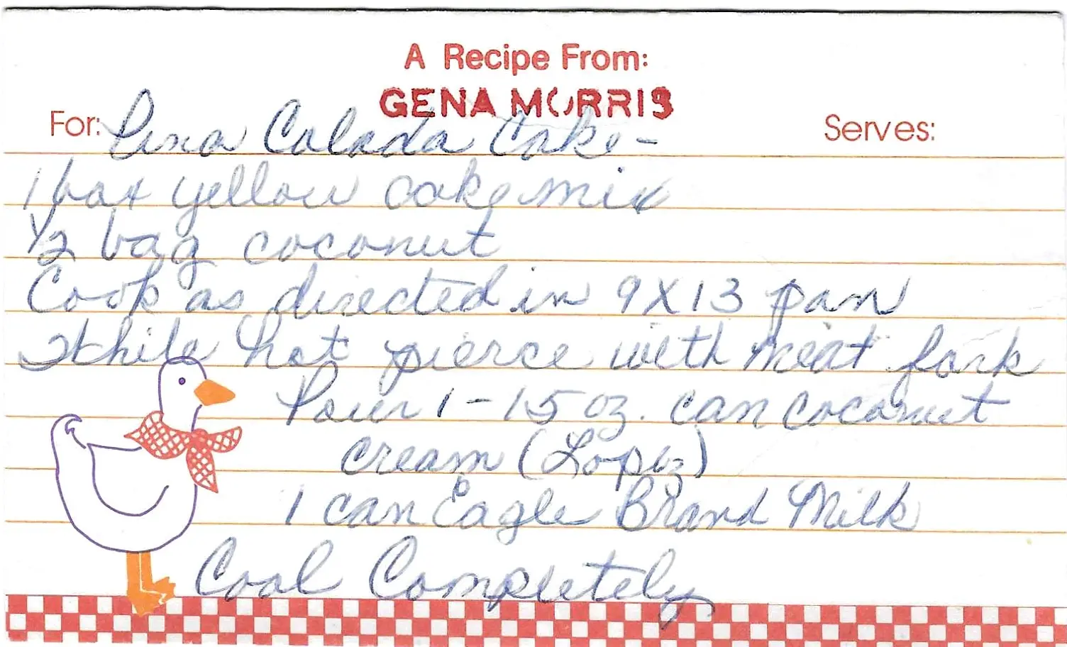 An incredibly moist and tropical poke cake from Gena Morris. A simple yellow cake is poked while warm and saturated with a rich blend of cream of coconut and sweetened condensed milk, then topped with a fluffy Cool Whip and coconut frosting.