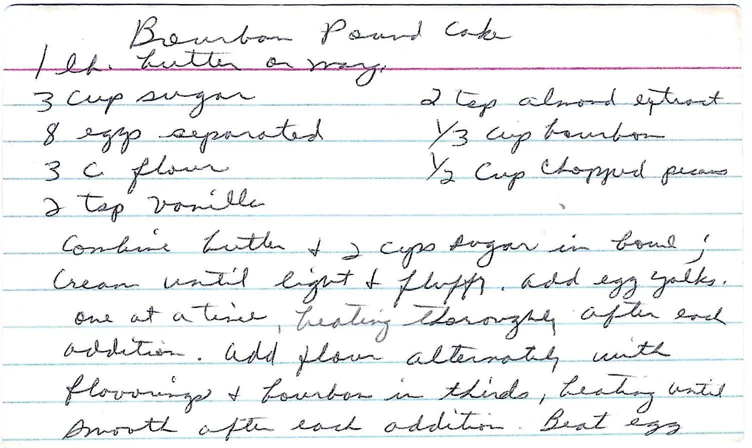 A classic, rich pound cake with a Southern twist, featuring a full pound of butter and flavored with bourbon, vanilla, and almond extracts. This recipe uses a unique method of folding the batter into beaten egg whites for a surprisingly light texture.