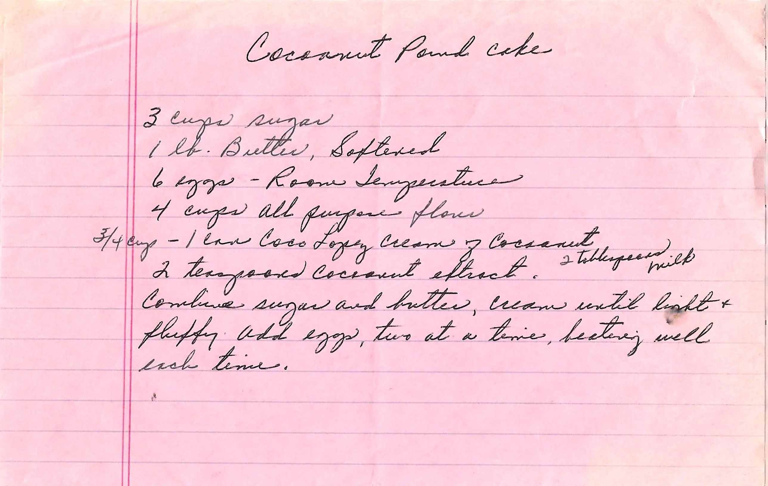 The original recipe card did not list baking powder or salt, which are important for the cake’s texture and flavor. Standard amounts have been added to create a complete recipe.