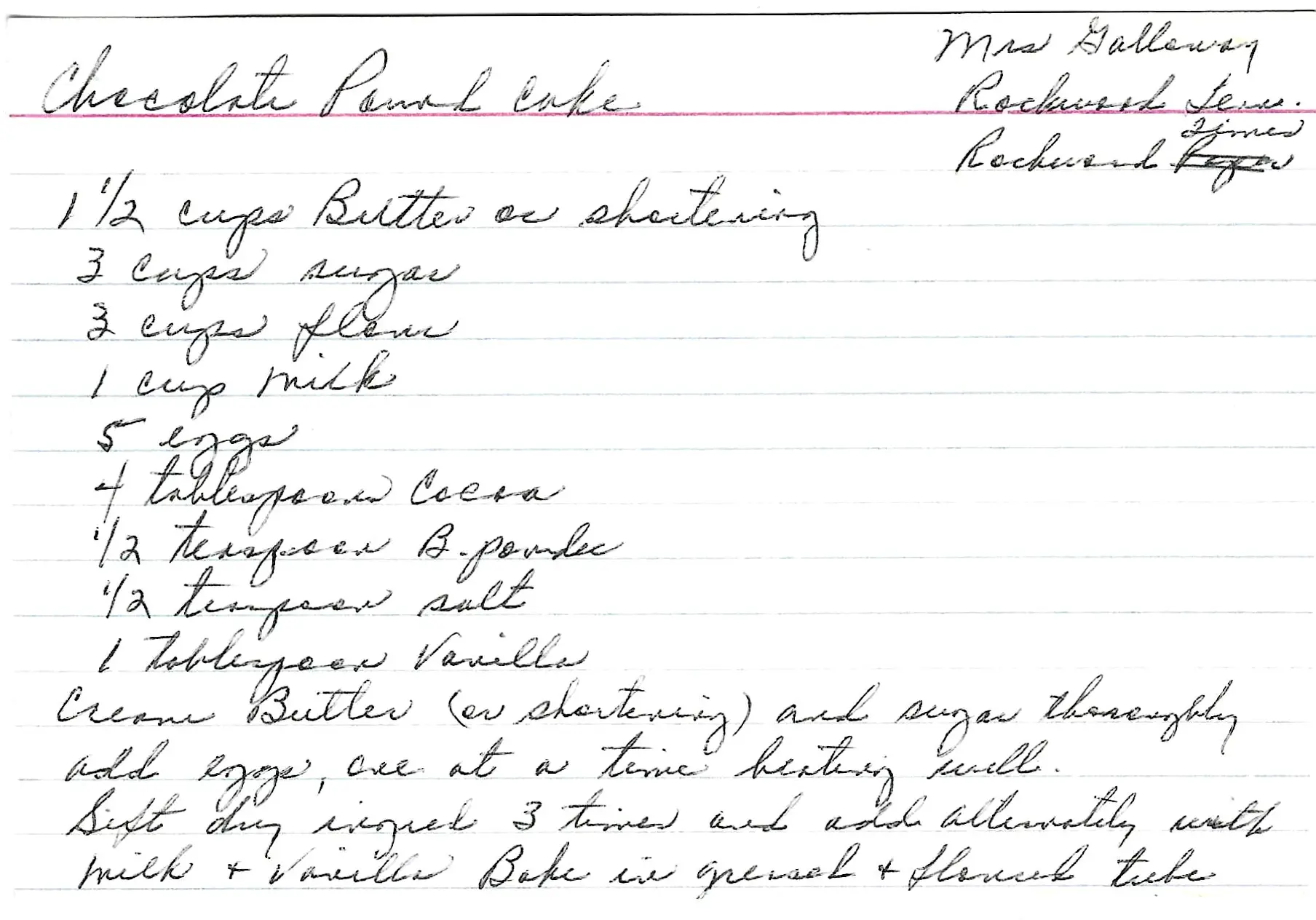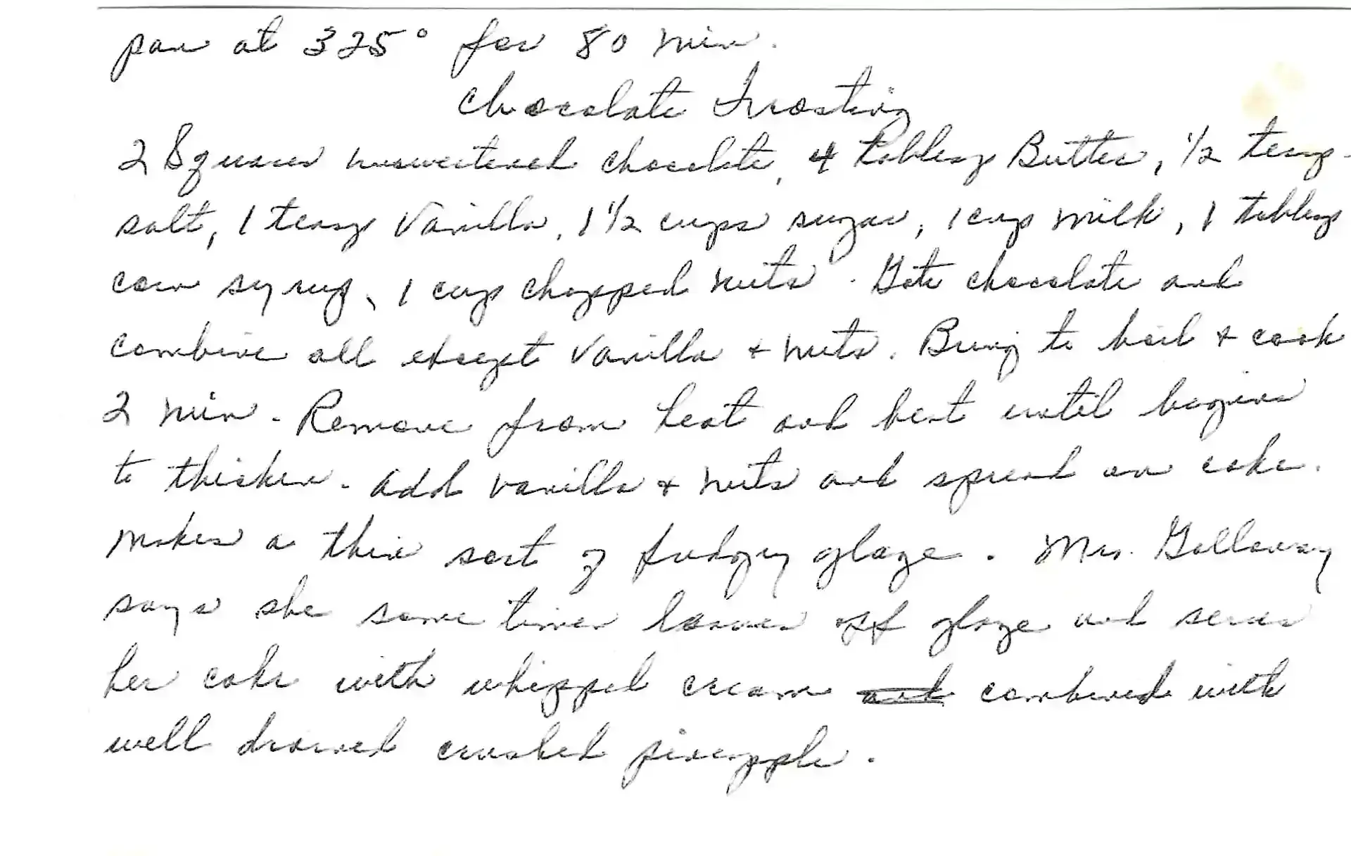 The original recipe card calls for a 375°F oven, which is quite high for a long-baking pound cake. A lower temperature of 350°F is recommended to prevent the outside from becoming too dark before the center is cooked. Mrs. Galloway also notes she sometimes serves the cake plain with whipped cream and crushed pineapple instead of the cooked frosting.