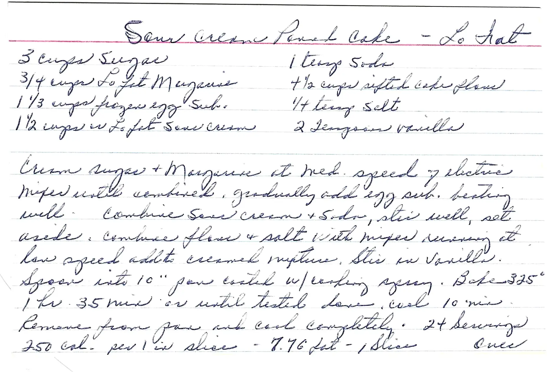 A lighter version of a classic sour cream pound cake, this recipe from Cooking Light Desserts uses low-fat margarine and egg substitute to reduce the fat without sacrificing the moist, tender crumb.