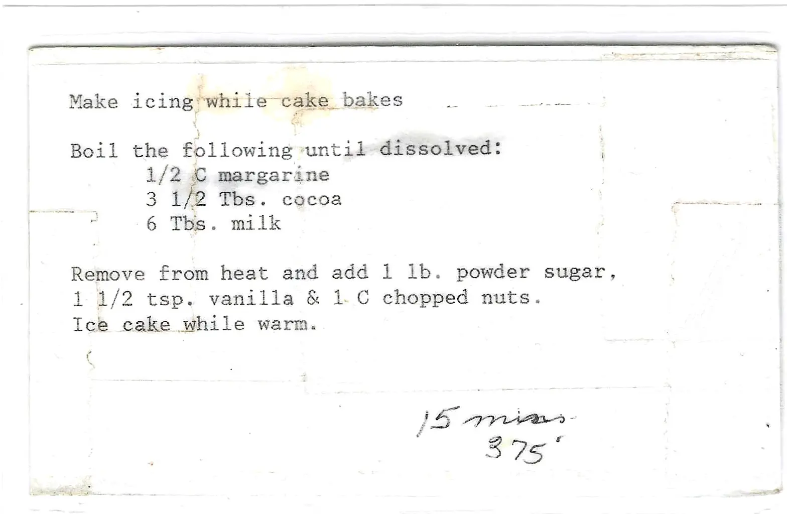 - Pour the warm icing over the cake while the cake is still hot from the oven. Spread quickly and evenly.
