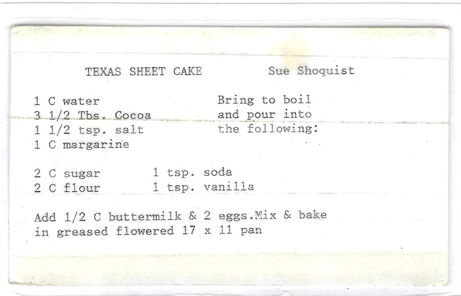 A classic Texas Sheet Cake recipe from Sue Shoquist. This large, crowd-pleasing cake is baked in a sheet pan and topped with a warm, fudgy cocoa and pecan icing.
