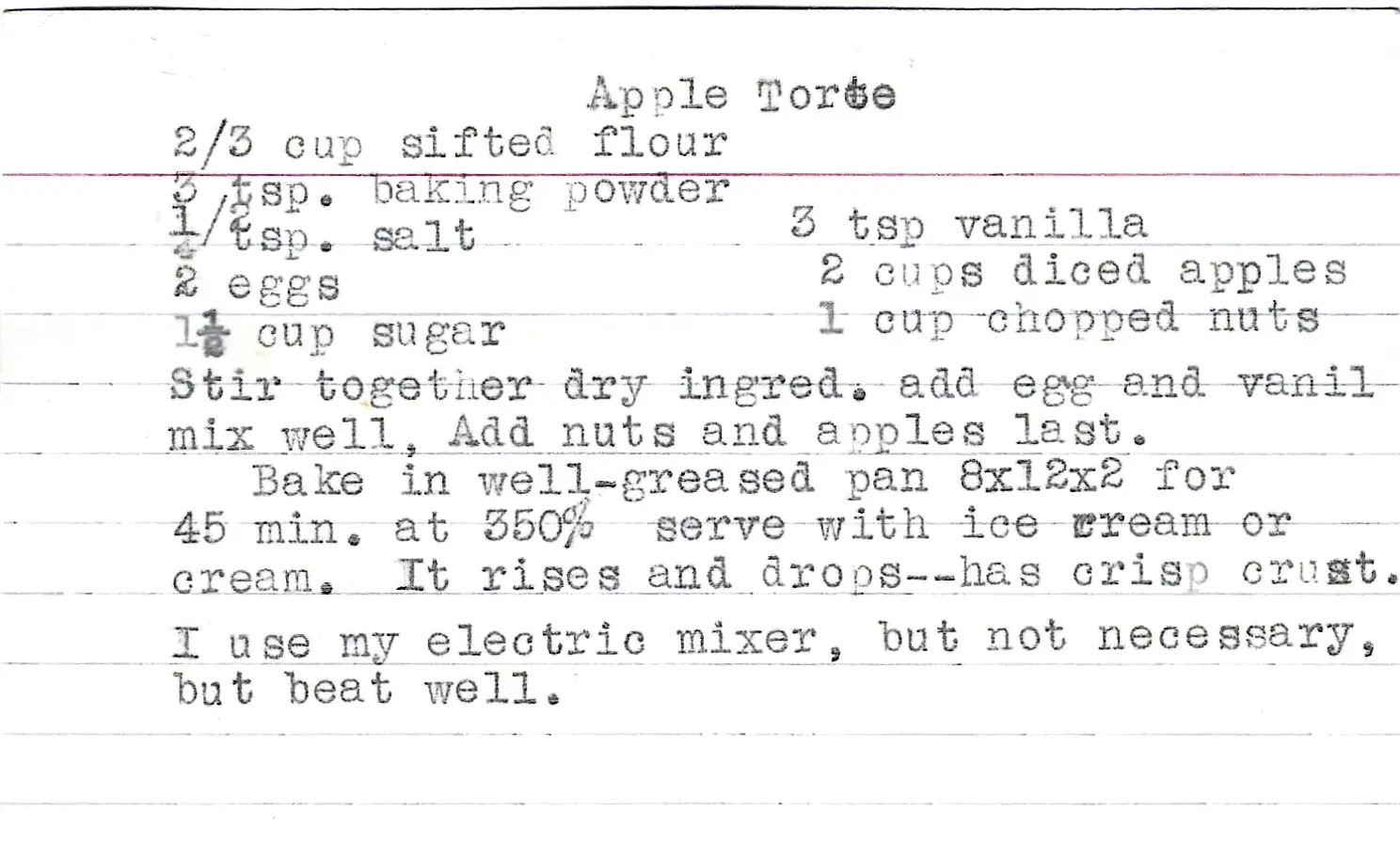 As the original recipe card notes, this torte “rises and drops” and “has crisp crust,” which is a normal and delicious characteristic of this style of dessert.