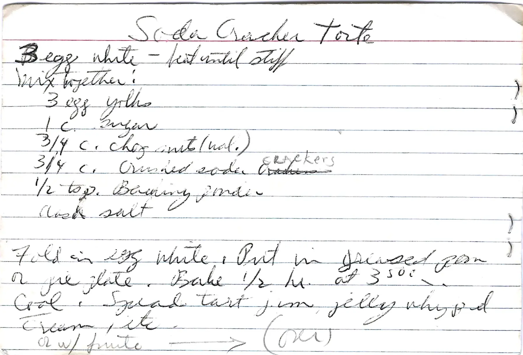 A classic, vintage torte with a unique, chewy texture. This flourless dessert gets its structure from crushed soda crackers and beaten egg whites, and is packed with chopped nuts.