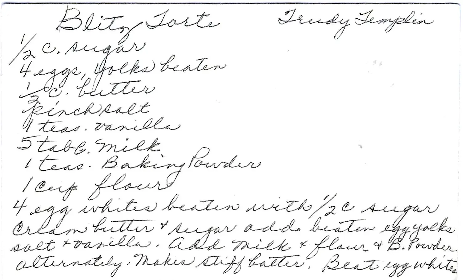A classic German Blitz Torte from a recipe by Trudy Templin. This impressive dessert features a tender cake base and a crisp meringue top that are baked together, then split and filled with a sweet pineapple filling.