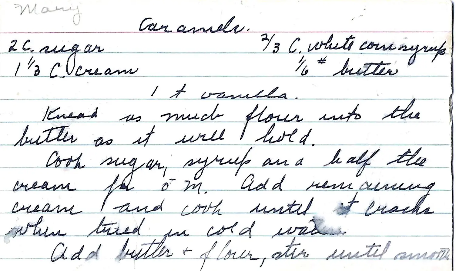 A unique vintage caramel recipe from Mary, where flour is kneaded into butter before being added to the boiling syrup. This unusual technique likely creates a distinct, chewy texture.