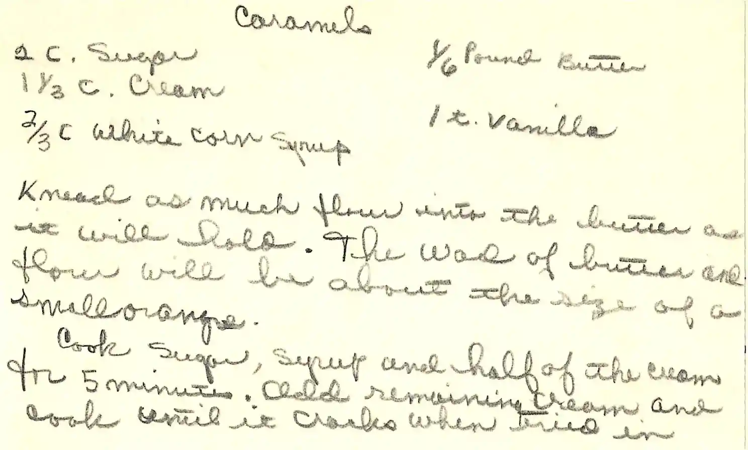 A unique vintage caramel recipe where flour is kneaded into butter before being added to the boiling syrup. This unusual technique likely creates a distinct, chewy texture.