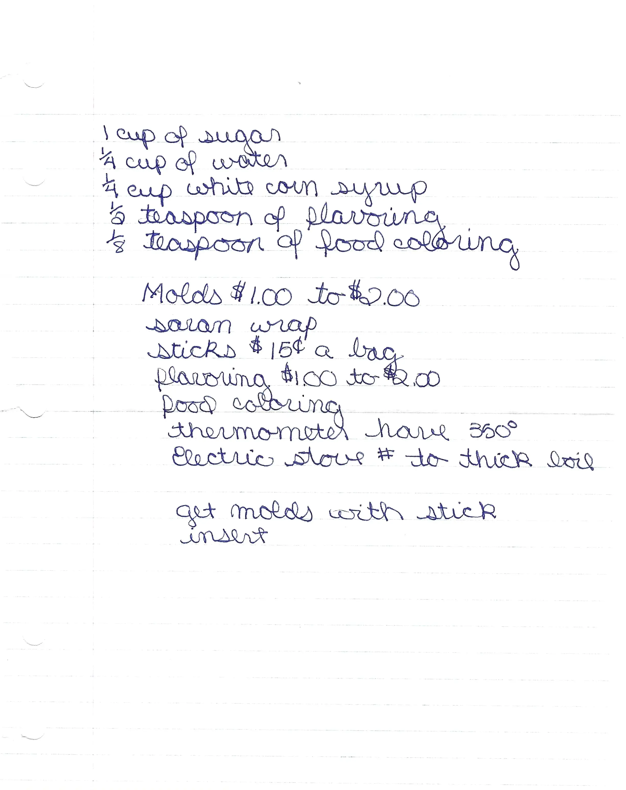 The original recipe card did not include instructions. The steps above are the standard method for making hard candy. The card’s note to “have 350°” on a thermometer is incorrect for hard candy; the proper temperature is the hard-crack stage (300-310°F).