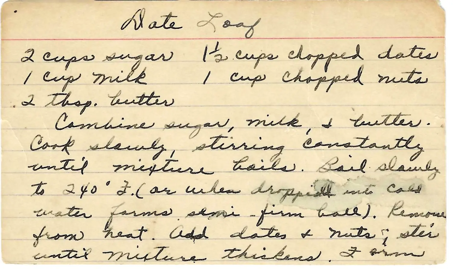 A classic, no-bake confection, this Date Loaf is a sweet candy roll made by cooking a sugar and milk syrup to the soft-ball stage, then mixing in chopped dates and nuts.